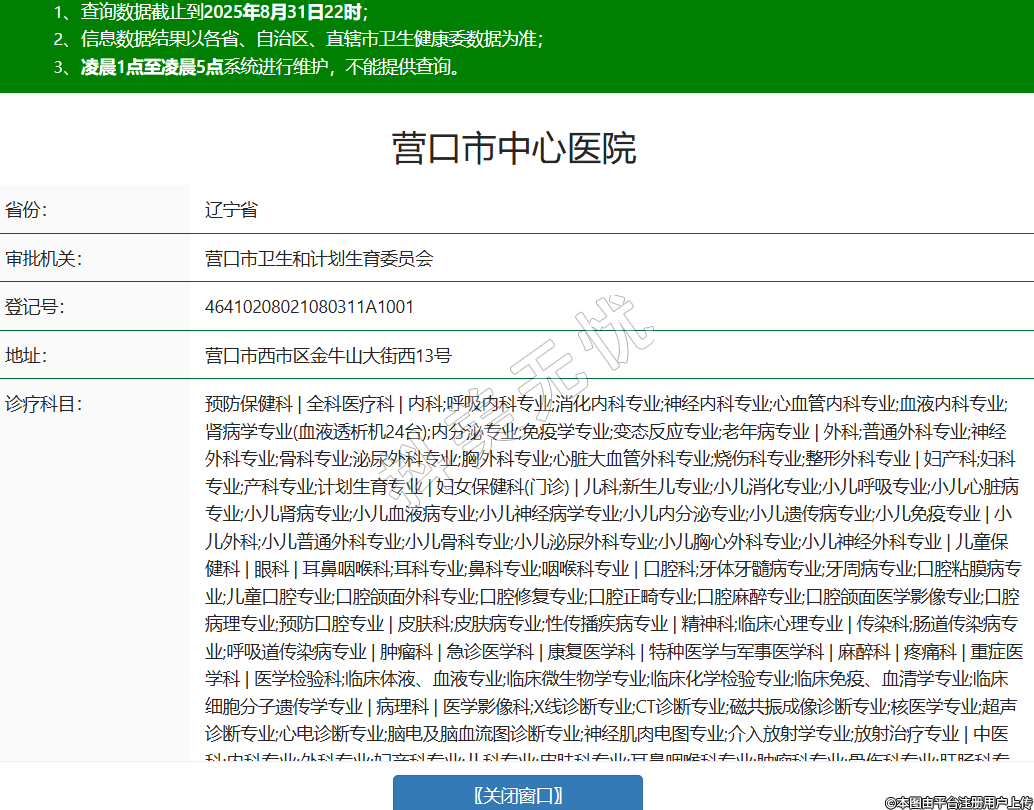 省份:遼寧省審批機(jī)關(guān):營(yíng)口市衛(wèi)生和計(jì)劃生育委員會(huì)登記號(hào):46410208021080311A1001地址:營(yíng)口市西市區(qū)金牛山大街西13號(hào)診療科目:預(yù)防保健科 | 全科醫(yī)療科 | 內(nèi)科;呼吸內(nèi)科專業(yè);消化內(nèi)科專業(yè);神經(jīng)內(nèi)科專業(yè);心血管內(nèi)科專業(yè);血液內(nèi)科專業(yè);腎病學(xué)專業(yè)(血液透析機(jī)24臺(tái));內(nèi)分泌專業(yè);免疫學(xué)專業(yè);變態(tài)反應(yīng)專業(yè);老年病專業(yè) | 外科;普通外科專業(yè);神經(jīng)外科專業(yè);骨科專業(yè);泌尿外科專業(yè);胸外科專業(yè);心臟大血管外科專業(yè);燒傷科專業(yè);整形外科專業(yè) | 婦產(chǎn)科;婦科專業(yè);產(chǎn)科專業(yè);計(jì)劃生育專業(yè) | 婦女保健科(門診) | 兒科;新生兒專業(yè);小兒消化專業(yè);小兒呼吸專業(yè);小兒心臟病專業(yè);小兒腎病專業(yè);小兒血液病專業(yè);小兒神經(jīng)病學(xué)專業(yè);小兒內(nèi)分泌專業(yè);小兒遺傳病專業(yè);小兒免疫專業(yè) | 小兒外科;小兒普通外科專業(yè);小兒骨科專業(yè);小兒泌尿外科專業(yè);小兒胸心外科專業(yè);小兒神經(jīng)外科專業(yè) | 兒童保健科 | 眼科 | 耳鼻咽喉科;耳科專業(yè);鼻科專業(yè);咽喉科專業(yè) | 口腔科;牙體牙髓病專業(yè);牙周病專業(yè);口腔粘膜病專業(yè);兒童口腔專業(yè);口腔頜面外科專業(yè);口腔修復(fù)專業(yè);口腔正畸專業(yè);口腔麻醉專業(yè);口腔頜面醫(yī)學(xué)影像專業(yè);口腔病理專業(yè);預(yù)防口腔專業(yè) | 皮膚科;皮膚病專業(yè);性傳播疾病專業(yè) | 精神科;臨床心理專業(yè) | 傳染科;腸道傳染病專業(yè);呼吸道傳染病專業(yè) | 腫瘤科 | 急診醫(yī)學(xué)科 | 康復(fù)醫(yī)學(xué)科 | 特種醫(yī)學(xué)與軍事醫(yī)學(xué)科 | 麻醉科 | 疼痛科 | 重癥醫(yī)學(xué)科 | 醫(yī)學(xué)檢驗(yàn)科;臨床體液、血液專業(yè);臨床微生物學(xué)專業(yè);臨床化學(xué)檢驗(yàn)專業(yè);臨床免疫、血清學(xué)專業(yè);臨床細(xì)胞分子遺傳學(xué)專業(yè) | 病理科 | 醫(yī)學(xué)影像科;X線診斷專業(yè);CT診斷專業(yè);磁共振成像診斷專業(yè);核醫(yī)學(xué)專業(yè);超聲診斷專業(yè);心電診斷專業(yè);腦電及腦血流圖診斷專業(yè);神經(jīng)肌肉電圖專業(yè);介入放射學(xué)專業(yè);放射治療專業(yè) | 中醫(yī)科;內(nèi)科專業(yè);外科專業(yè);婦產(chǎn)科專業(yè);兒科專業(yè);皮膚科專業(yè);耳鼻咽喉科專業(yè);腫瘤科專業(yè);骨傷科專業(yè);肛腸科專業(yè);老年病科專業(yè);針灸科專業(yè);推拿科專業(yè);康復(fù)醫(yī)學(xué)專業(yè) | 中西醫(yī)結(jié)合科(門診)******級(jí)別:三級(jí)法定代表人:劉學(xué)英主要負(fù)責(zé)人:劉學(xué)英執(zhí)業(yè)許可證有效期:2019/11/15 -至- 2034/11/14 -