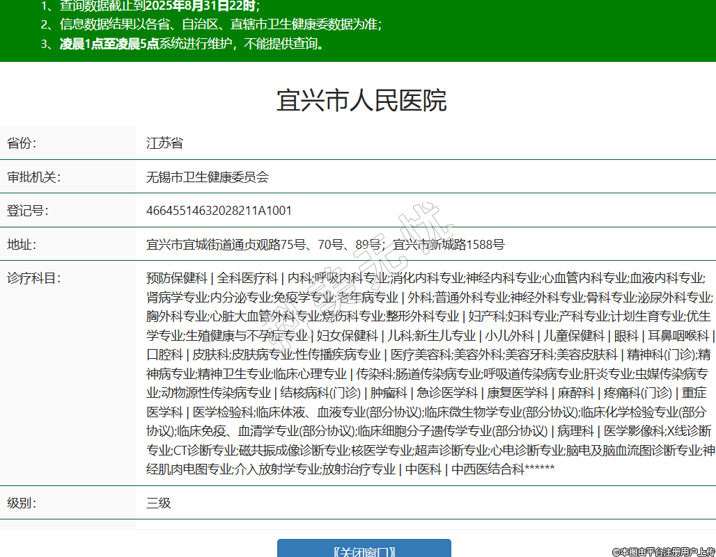 省份:江蘇省審批機(jī)關(guān):無(wú)錫市衛(wèi)生健康委員會(huì)登記號(hào):46645514632028211A1001地址:宜興市宜城街道通貞觀路75號(hào)、70號(hào)、89號(hào);宜興市新城路1588號(hào)診療科目:預(yù)防保健科 | 全科醫(yī)療科 | 內(nèi)科;呼吸內(nèi)科專(zhuān)業(yè);消化內(nèi)科專(zhuān)業(yè);神經(jīng)內(nèi)科專(zhuān)業(yè);心血管內(nèi)科專(zhuān)業(yè);血液內(nèi)科專(zhuān)業(yè);腎病學(xué)專(zhuān)業(yè);內(nèi)分泌專(zhuān)業(yè);免疫學(xué)專(zhuān)業(yè);老年病專(zhuān)業(yè) | 外科;普通外科專(zhuān)業(yè);神經(jīng)外科專(zhuān)業(yè);骨科專(zhuān)業(yè);泌尿外科專(zhuān)業(yè);胸外科專(zhuān)業(yè);心臟大血管外科專(zhuān)業(yè);燒傷科專(zhuān)業(yè);整形外科專(zhuān)業(yè) | 婦產(chǎn)科;婦科專(zhuān)業(yè);產(chǎn)科專(zhuān)業(yè);計(jì)劃生育專(zhuān)業(yè);優(yōu)生學(xué)專(zhuān)業(yè);生殖健康與不孕癥專(zhuān)業(yè) | 婦女保健科 | 兒科;新生兒專(zhuān)業(yè) | 小兒外科 | 兒童保健科 | 眼科 | 耳鼻咽喉科 | 口腔科 | 皮膚科;皮膚病專(zhuān)業(yè);性傳播疾病專(zhuān)業(yè) | 醫(yī)療美容科;美容外科;美容牙科;美容皮膚科 | 精神科(門(mén)診);精神病專(zhuān)業(yè);精神衛(wèi)生專(zhuān)業(yè);臨床心理專(zhuān)業(yè) | 傳染科;腸道傳染病專(zhuān)業(yè);呼吸道傳染病專(zhuān)業(yè);肝炎專(zhuān)業(yè);蟲(chóng)媒傳染病專(zhuān)業(yè);動(dòng)物源性傳染病專(zhuān)業(yè) | 結(jié)核病科(門(mén)診) | 腫瘤科 | 急診醫(yī)學(xué)科 | 康復(fù)醫(yī)學(xué)科 | 麻醉科 | 疼痛科(門(mén)診) | 重癥醫(yī)學(xué)科 | 醫(yī)學(xué)檢驗(yàn)科;臨床體液、血液專(zhuān)業(yè)(部分協(xié)議);臨床微生物學(xué)專(zhuān)業(yè)(部分協(xié)議);臨床化學(xué)檢驗(yàn)專(zhuān)業(yè)(部分協(xié)議);臨床免疫、血清學(xué)專(zhuān)業(yè)(部分協(xié)議);臨床細(xì)胞分子遺傳學(xué)專(zhuān)業(yè)(部分協(xié)議) | 病理科 | 醫(yī)學(xué)影像科;X線(xiàn)診斷專(zhuān)業(yè);CT診斷專(zhuān)業(yè);磁共振成像診斷專(zhuān)業(yè);核醫(yī)學(xué)專(zhuān)業(yè);超聲診斷專(zhuān)業(yè);心電診斷專(zhuān)業(yè);腦電及腦血流圖診斷專(zhuān)業(yè);神經(jīng)肌肉電圖專(zhuān)業(yè);介入放射學(xué)專(zhuān)業(yè);放射治療專(zhuān)業(yè) | 中醫(yī)科 | 中西醫(yī)結(jié)合科******級(jí)別:三級(jí)法定代表人:吳俊東主要負(fù)責(zé)人:吳俊東執(zhí)業(yè)許可證有效期:2021/12/19 -至- 2036/12/18 -