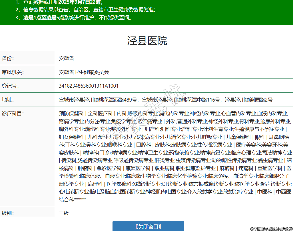省份:安徽省審批機關(guān):安徽省衛(wèi)生健康委員會登記號:34182348636001311A1001地址:宣城市涇縣涇川鎮(zhèn)桃花潭西路489號;宣城市涇縣涇川鎮(zhèn)桃花潭中路116號,涇縣涇川鎮(zhèn)謝園路2號診療科目:預防保健科 | 全科醫(yī)療科 | 內(nèi)科;呼吸內(nèi)科專業(yè);消化內(nèi)科專業(yè);神經(jīng)內(nèi)科專業(yè);心血管內(nèi)科專業(yè);血液內(nèi)科專業(yè);腎病學專業(yè);內(nèi)分泌專業(yè);免疫學專業(yè);老年病專業(yè) | 外科;普通外科專業(yè);神經(jīng)外科專業(yè);骨科專業(yè);泌尿外科專業(yè);胸外科專業(yè);燒傷科專業(yè);整形外科專業(yè) | 婦產(chǎn)科;婦科專業(yè);產(chǎn)科專業(yè);計劃生育專業(yè);生殖健康與不孕癥專業(yè) | 婦女保健科 | 兒科;新生兒專業(yè);小兒傳染病專業(yè);小兒消化專業(yè);小兒呼吸專業(yè) | 兒童保健科 | 眼科 | 耳鼻咽喉科;耳科專業(yè);鼻科專業(yè);咽喉科專業(yè) | 口腔科 | 皮膚科;皮膚病專業(yè);性傳播疾病專業(yè) | 醫(yī)療美容科;美容牙科;美容皮膚科 | 精神科(門診);精神病專業(yè);精神衛(wèi)生專業(yè);藥物依賴專業(yè);精神康復專業(yè);臨床心理專業(yè);司法精神專業(yè) | 傳染科;腸道傳染病專業(yè);呼吸道傳染病專業(yè);肝炎專業(yè);蟲媒傳染病專業(yè);動物源性傳染病專業(yè);蠕蟲病專業(yè) | 結(jié)核病科 | 腫瘤科 | 急診醫(yī)學科 | 康復醫(yī)學科 | 職業(yè)病科;職業(yè)健康監(jiān)護專業(yè) | 麻醉科 | 疼痛科 | 重癥醫(yī)學科 | 醫(yī)學檢驗科;臨床體液、血液專業(yè);臨床微生物學專業(yè);臨床化學檢驗專業(yè);臨床免疫、血清學專業(yè);臨床細胞分子遺傳學專業(yè) | 病理科 | 醫(yī)學影像科;X線診斷專業(yè);CT診斷專業(yè);磁共振成像診斷專業(yè);核醫(yī)學專業(yè);超聲診斷專業(yè);心電診斷專業(yè);腦電及腦血流圖診斷專業(yè);神經(jīng)肌肉電圖專業(yè);介入放射學專業(yè);放射治療專業(yè) | 中醫(yī)科 | 中西醫(yī)結(jié)合科******級別:三級法定代表人:潘志剛主要負責人:潘志剛執(zhí)業(yè)許可證有效期:2023/11/17 -至- 2035/11/11 -