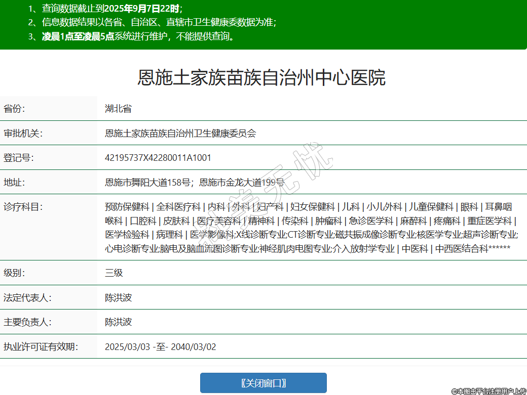 省份:湖北省審批機(jī)關(guān):恩施土家族苗族自治州衛(wèi)生健康委員會(huì)登記號(hào):42195737X42280011A1001地址:恩施市舞陽(yáng)大道158號(hào);恩施市金龍大道199號(hào)診療科目:預(yù)防保健科 | 全科醫(yī)療科 | 內(nèi)科 | 外科 | 婦產(chǎn)科 | 婦女保健科 | 兒科 | 小兒外科 | 兒童保健科 | 眼科 | 耳鼻咽喉科 | 口腔科 | 皮膚科 | 醫(yī)療美容科 | 精神科 | 傳染科 | 腫瘤科 | 急診醫(yī)學(xué)科 | 麻醉科 | 疼痛科 | 重癥醫(yī)學(xué)科 | 醫(yī)學(xué)檢驗(yàn)科 | 病理科 | 醫(yī)學(xué)影像科;X線診斷專業(yè);CT診斷專業(yè);磁共振成像診斷專業(yè);核醫(yī)學(xué)專業(yè);超聲診斷專業(yè);心電診斷專業(yè);腦電及腦血流圖診斷專業(yè);神經(jīng)肌肉電圖專業(yè);介入放射學(xué)專業(yè) | 中醫(yī)科 | 中西醫(yī)結(jié)合科******級(jí)別:三級(jí)法定代表人:陳洪波主要負(fù)責(zé)人:陳洪波執(zhí)業(yè)許可證有效期:2025/03/03 -至- 2040/03/02 -