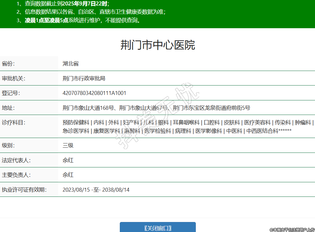 省份:湖北省審批機(jī)關(guān):荊門市行政審批局登記號:42070780342080111A1001地址:荊門市象山大道168號、荊門市象山大道67號、荊門市東寶區(qū)龍泉街道府前街5號診療科目:預(yù)防保健科 | 內(nèi)科 | 外科 | 婦產(chǎn)科 | 兒科 | 眼科 | 耳鼻咽喉科 | 口腔科 | 皮膚科 | 醫(yī)療美容科 | 傳染科 | 腫瘤科 | 急診醫(yī)學(xué)科 | 康復(fù)醫(yī)學(xué)科 | 麻醉科 | 醫(yī)學(xué)檢驗(yàn)科 | 病理科 | 醫(yī)學(xué)影像科 | 中醫(yī)科 | 中西醫(yī)結(jié)合科******級別:三級法定代表人:余紅主要負(fù)責(zé)人:余紅執(zhí)業(yè)許可證有效期:2023/08/15 -至- 2038/08/14 -