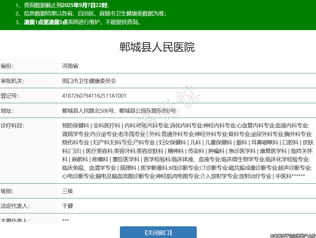 省份:河南省審批機(jī)關(guān):周口市衛(wèi)生健康委員會登記號:41872607941162511A1001地址:鄲城縣人民路北506號、鄲城縣公園東路東側(cè)9號診療科目:預(yù)防保健科 | 全科醫(yī)療科 | 內(nèi)科;呼吸內(nèi)科專業(yè);消化內(nèi)科專業(yè);神經(jīng)內(nèi)科專業(yè);心血管內(nèi)科專業(yè);血液內(nèi)科專業(yè);腎病學(xué)專業(yè);內(nèi)分泌專業(yè);老年病專業(yè) | 外科;普通外科專業(yè);神經(jīng)外科專業(yè);骨科專業(yè);泌尿外科專業(yè);胸外科專業(yè);燒傷科專業(yè) | 婦產(chǎn)科;婦科專業(yè);產(chǎn)科專業(yè) | 婦女保健科 | 兒科 | 兒童保健科 | 眼科 | 耳鼻咽喉科 | 口腔科 | 皮膚科(門診) | 醫(yī)療美容科;美容外科;美容皮膚科 | 精神科 | 傳染科 | 腫瘤科 | 急診醫(yī)學(xué)科 | 康復(fù)醫(yī)學(xué)科 | 臨終關(guān)懷科 | 麻醉科 | 疼痛科 | 重癥醫(yī)學(xué)科 | 醫(yī)學(xué)檢驗(yàn)科;臨床體液、血液專業(yè);臨床微生物學(xué)專業(yè);臨床化學(xué)檢驗(yàn)專業(yè);臨床免疫、血清學(xué)專業(yè) | 病理科 | 醫(yī)學(xué)影像科;X線診斷專業(yè);CT診斷專業(yè);磁共振成像診斷專業(yè);超聲診斷專業(yè);心電診斷專業(yè);腦電及腦血流圖診斷專業(yè);神經(jīng)肌肉電圖專業(yè);介入放射學(xué)專業(yè);放射治療專業(yè) | 中醫(yī)科******級別:三級法定代表人:于健主要負(fù)責(zé)人:***執(zhí)業(yè)許可證有效期:2025/03/01 -至- 2036/12/26 -