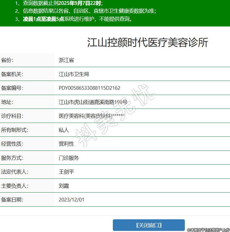 省份:浙江省備案機(jī)關(guān):江山市衛(wèi)生局備案編號(hào):PDY00586533088115D2162地址:江山市虎山街道鹿溪南路198號(hào)診療科目:醫(yī)療美容科(美容皮膚科)******所有制形式:私人經(jīng)營(yíng)性質(zhì):營(yíng)利性服務(wù)方式:門診服務(wù)法定代表人:王劍平主要負(fù)責(zé)人:劉霞備案日期:2023/12/01 -