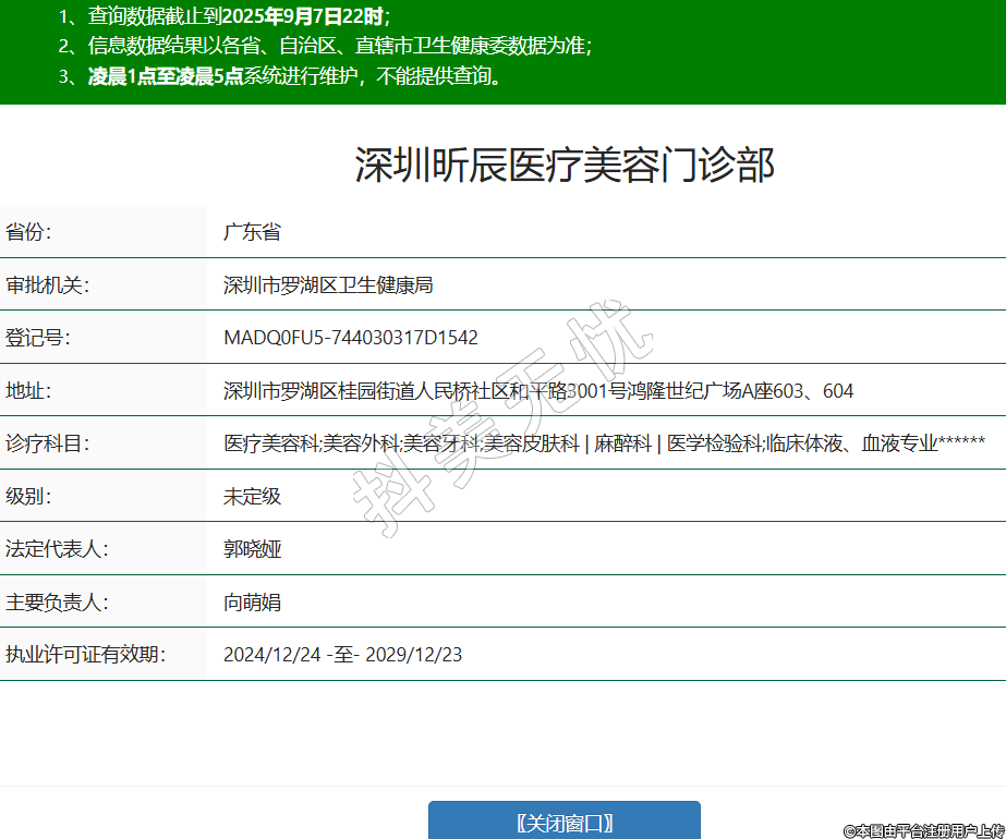 省份:廣東省審批機(jī)關(guān):深圳市羅湖區(qū)衛(wèi)生健康局登記號(hào):MADQ0FU5-744030317D1542地址:深圳市羅湖區(qū)桂園街道人民橋社區(qū)和平路3001號(hào)鴻隆世紀(jì)廣場(chǎng)A座603、604診療科目:醫(yī)療美容科;美容外科;美容牙科;美容皮膚科 | 麻醉科 | 醫(yī)學(xué)檢驗(yàn)科;臨床體液、血液專業(yè)******級(jí)別:未定級(jí)法定代表人:郭曉婭主要負(fù)責(zé)人:向萌娟執(zhí)業(yè)許可證有效期:2024/12/24 -至- 2029/12/23 -