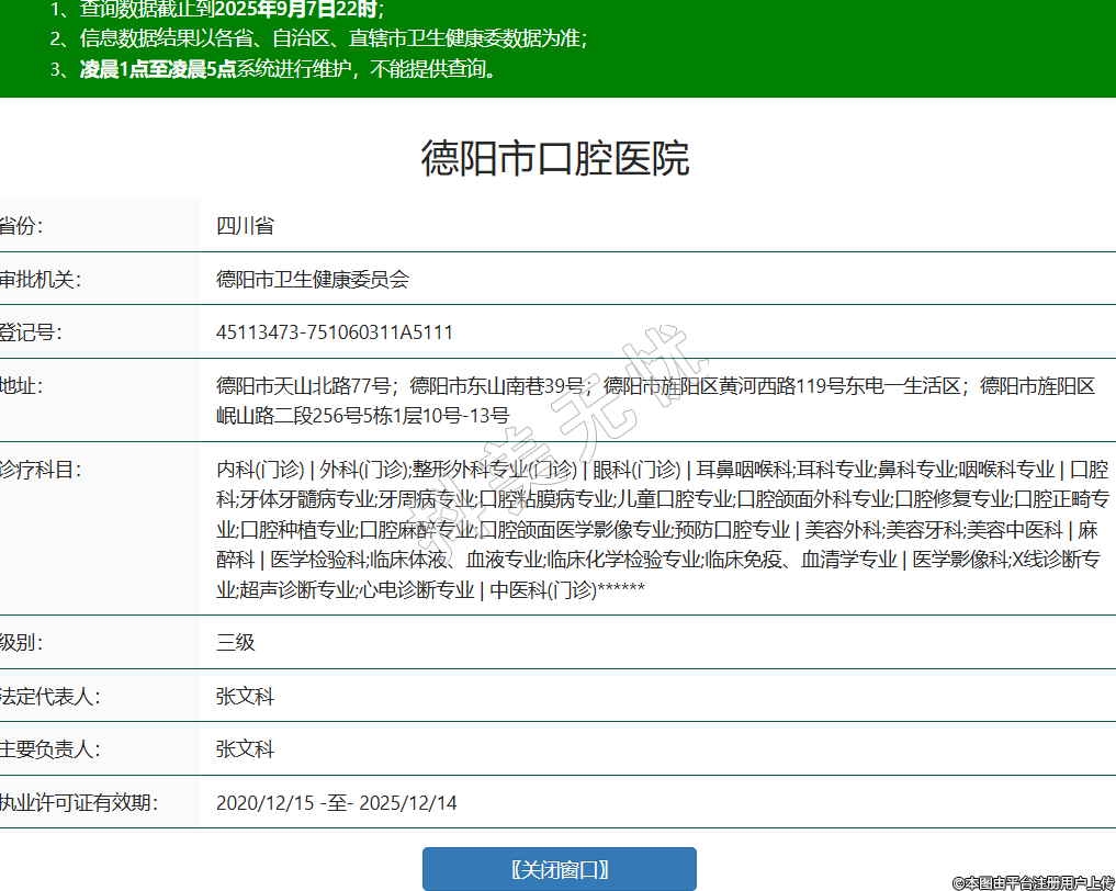 省份:四川省審批機(jī)關(guān):德陽(yáng)市衛(wèi)生健康委員會(huì)登記號(hào):45113473-751060311A5111地址:德陽(yáng)市天山北路77號(hào);德陽(yáng)市東山南巷39號(hào);德陽(yáng)市旌陽(yáng)區(qū)黃河西路119號(hào)東電一生活區(qū);德陽(yáng)市旌陽(yáng)區(qū)岷山路二段256號(hào)5棟1層10號(hào)-13號(hào)診療科目:內(nèi)科(門(mén)診) | 外科(門(mén)診);整形外科專(zhuān)業(yè)(門(mén)診) | 眼科(門(mén)診) | 耳鼻咽喉科;耳科專(zhuān)業(yè);鼻科專(zhuān)業(yè);咽喉科專(zhuān)業(yè) | 口腔科;牙體牙髓病專(zhuān)業(yè);牙周病專(zhuān)業(yè);口腔粘膜病專(zhuān)業(yè);兒童口腔專(zhuān)業(yè);口腔頜面外科專(zhuān)業(yè);口腔修復(fù)專(zhuān)業(yè);口腔正畸專(zhuān)業(yè);口腔種植專(zhuān)業(yè);口腔麻醉專(zhuān)業(yè);口腔頜面醫(yī)學(xué)影像專(zhuān)業(yè);預(yù)防口腔專(zhuān)業(yè) | 美容外科;美容牙科;美容中醫(yī)科 | 麻醉科 | 醫(yī)學(xué)檢驗(yàn)科;臨床體液、血液專(zhuān)業(yè);臨床化學(xué)檢驗(yàn)專(zhuān)業(yè);臨床免疫、血清學(xué)專(zhuān)業(yè) | 醫(yī)學(xué)影像科;X線診斷專(zhuān)業(yè);超聲診斷專(zhuān)業(yè);心電診斷專(zhuān)業(yè) | 中醫(yī)科(門(mén)診)******級(jí)別:三級(jí)法定代表人:張文科主要負(fù)責(zé)人:張文科執(zhí)業(yè)許可證有效期:2020/12/15 -至- 2025/12/14 -