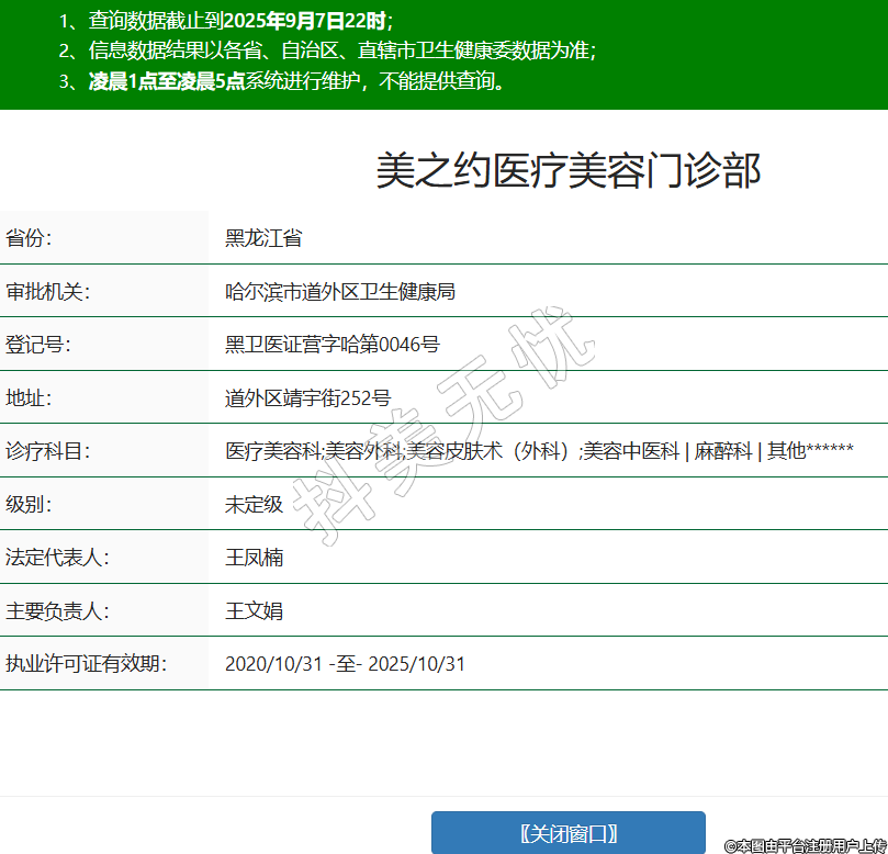 省份:黑龍江省審批機(jī)關(guān):哈爾濱市道外區(qū)衛(wèi)生健康局登記號(hào):黑衛(wèi)醫(yī)證營(yíng)字哈第0046號(hào)地址:道外區(qū)靖宇街252號(hào)診療科目:醫(yī)療美容科;美容外科;美容皮膚術(shù)(外科);美容中醫(yī)科 | 麻醉科 | 其他******級(jí)別:未定級(jí)法定代表人:王鳳楠主要負(fù)責(zé)人:王文娟執(zhí)業(yè)許可證有效期:2020/10/31 -至- 2025/10/31 -