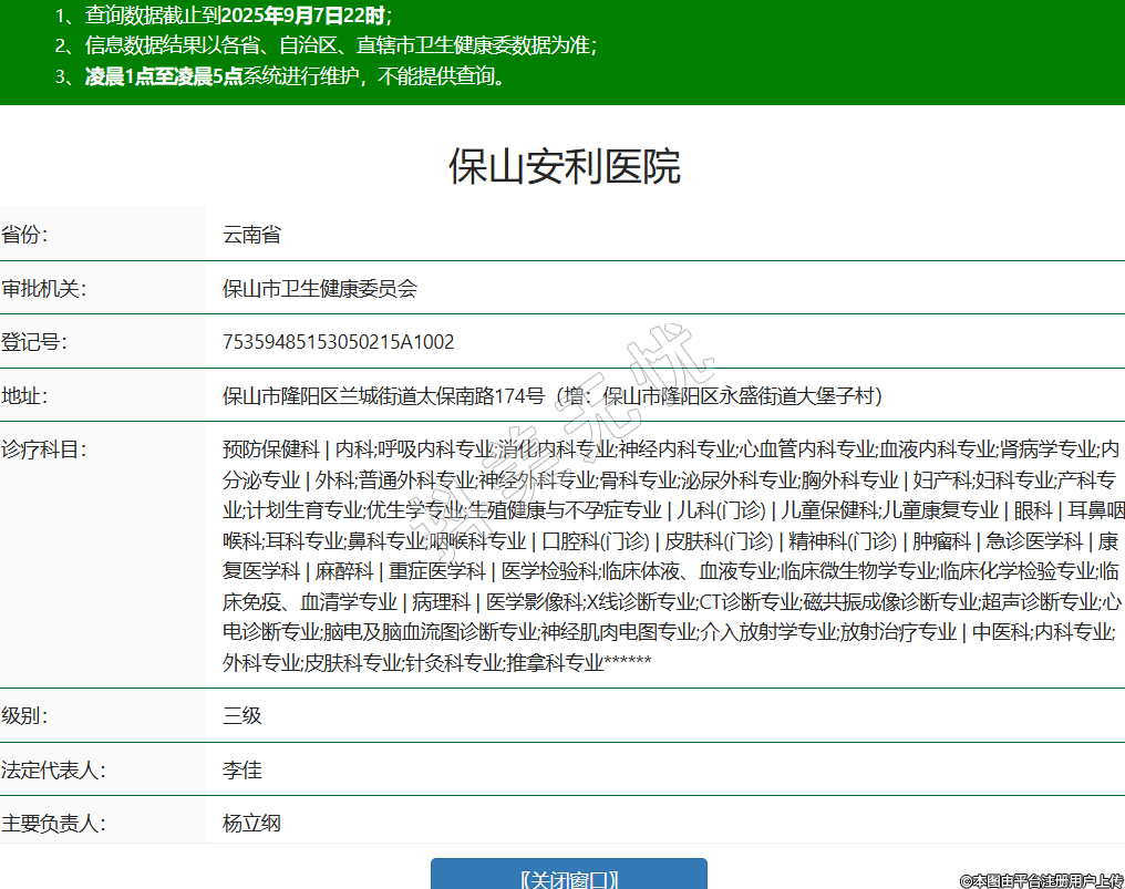 省份:云南省審批機(jī)關(guān):保山市衛(wèi)生健康委員會登記號:75359485153050215A1002地址:保山市隆陽區(qū)蘭城街道太保南路174號(增:保山市隆陽區(qū)永盛街道大堡子村)診療科目:預(yù)防保健科 | 內(nèi)科;呼吸內(nèi)科專業(yè);消化內(nèi)科專業(yè);神經(jīng)內(nèi)科專業(yè);心血管內(nèi)科專業(yè);血液內(nèi)科專業(yè);腎病學(xué)專業(yè);內(nèi)分泌專業(yè) | 外科;普通外科專業(yè);神經(jīng)外科專業(yè);骨科專業(yè);泌尿外科專業(yè);胸外科專業(yè) | 婦產(chǎn)科;婦科專業(yè);產(chǎn)科專業(yè);計劃生育專業(yè);優(yōu)生學(xué)專業(yè);生殖健康與不孕癥專業(yè) | 兒科(門診) | 兒童保健科;兒童康復(fù)專業(yè) | 眼科 | 耳鼻咽喉科;耳科專業(yè);鼻科專業(yè);咽喉科專業(yè) | 口腔科(門診) | 皮膚科(門診) | 精神科(門診) | 腫瘤科 | 急診醫(yī)學(xué)科 | 康復(fù)醫(yī)學(xué)科 | 麻醉科 | 重癥醫(yī)學(xué)科 | 醫(yī)學(xué)檢驗科;臨床體液、血液專業(yè);臨床微生物學(xué)專業(yè);臨床化學(xué)檢驗專業(yè);臨床免疫、血清學(xué)專業(yè) | 病理科 | 醫(yī)學(xué)影像科;X線診斷專業(yè);CT診斷專業(yè);磁共振成像診斷專業(yè);超聲診斷專業(yè);心電診斷專業(yè);腦電及腦血流圖診斷專業(yè);神經(jīng)肌肉電圖專業(yè);介入放射學(xué)專業(yè);放射治療專業(yè) | 中醫(yī)科;內(nèi)科專業(yè);外科專業(yè);皮膚科專業(yè);針灸科專業(yè);推拿科專業(yè)******級別:三級法定代表人:李佳主要負(fù)責(zé)人:楊立綱執(zhí)業(yè)許可證有效期:2025/07/28 -至- 2035/01/08 -