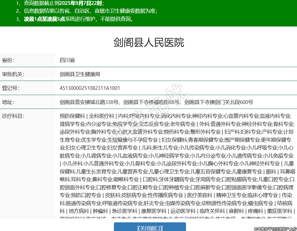 省份:四川省審批機關(guān):劍閣縣衛(wèi)生健康局登記號:45130000251082311A1001地址:劍閣縣普安鎮(zhèn)城北路338號、劍閣縣下寺鎮(zhèn)福臨街88號、劍閣縣下寺鎮(zhèn)劍門關(guān)北段600號診療科目:預(yù)防保健科 | 全科醫(yī)療科 | 內(nèi)科;呼吸內(nèi)科專業(yè);消化內(nèi)科專業(yè);神經(jīng)內(nèi)科專業(yè);心血管內(nèi)科專業(yè);血液內(nèi)科專業(yè);腎病學(xué)專業(yè);內(nèi)分泌專業(yè);免疫學(xué)專業(yè);變態(tài)反應(yīng)專業(yè);老年病專業(yè) | 外科;普通外科專業(yè);神經(jīng)外科專業(yè);骨科專業(yè);泌尿外科專業(yè);胸外科專業(yè);心臟大血管外科專業(yè);燒傷科專業(yè);整形外科專業(yè) | 婦產(chǎn)科;婦科專業(yè);產(chǎn)科專業(yè);計劃生育專業(yè);優(yōu)生學(xué)專業(yè);生殖健康與不孕癥專業(yè) | 婦女保健科;青春期保健專業(yè);圍產(chǎn)期保健專業(yè);更年期保健專業(yè);婦女心理衛(wèi)生專業(yè);婦女營養(yǎng)專業(yè) | 兒科;新生兒專業(yè);小兒傳染病專業(yè);小兒消化專業(yè);小兒呼吸專業(yè);小兒心臟病專業(yè);小兒腎病專業(yè);小兒血液病專業(yè);小兒神經(jīng)病學(xué)專業(yè);小兒內(nèi)分泌專業(yè);小兒遺傳病專業(yè);小兒免疫專業(yè) | 小兒外科;小兒普通外科專業(yè);小兒骨科專業(yè);小兒泌尿外科專業(yè);小兒胸心外科專業(yè);小兒神經(jīng)外科專業(yè) | 兒童保健科;兒童生長發(fā)育專業(yè);兒童營養(yǎng)專業(yè);兒童心理衛(wèi)生專業(yè);兒童五官保健專業(yè);兒童康復(fù)專業(yè) | 眼科 | 耳鼻咽喉科;耳科專業(yè);鼻科專業(yè);咽喉科專業(yè) | 口腔科;牙體牙髓病專業(yè);牙周病專業(yè);口腔粘膜病專業(yè);兒童口腔專業(yè);口腔頜面外科專業(yè);口腔修復(fù)專業(yè);口腔正畸專業(yè);口腔種植專業(yè);口腔麻醉專業(yè);口腔頜面醫(yī)學(xué)影像專業(yè);口腔病理專業(yè);預(yù)防口腔專業(yè) | 皮膚科;皮膚病專業(yè);性傳播疾病專業(yè) | 醫(yī)療美容科 | 精神衛(wèi)生專業(yè);臨床心理專業(yè) | 傳染科;腸道傳染病專業(yè);呼吸道傳染病專業(yè);肝炎專業(yè);蟲媒傳染病專業(yè);動物源性傳染病專業(yè);蠕蟲病專業(yè) | 結(jié)核病科 | 地方病科 | 腫瘤科 | 急診醫(yī)學(xué)科 | 康復(fù)醫(yī)學(xué)科 | 運動醫(yī)學(xué)科 | 臨終關(guān)懷科 | 麻醉科 | 疼痛科 | 重癥醫(yī)學(xué)科 | 醫(yī)學(xué)檢驗科;臨床體液、血液專業(yè);臨床微生物學(xué)專業(yè);臨床化學(xué)檢驗專業(yè);臨床免疫、血清學(xué)專業(yè);臨床細胞分子遺傳學(xué)專業(yè) | 病理科 | 醫(yī)學(xué)影像科;X線診斷專業(yè);CT診斷專業(yè);磁共振成像診斷專業(yè);超聲診斷專業(yè);心電診斷專業(yè);腦電及腦血流圖診斷專業(yè);神經(jīng)肌肉電圖專業(yè);介入放射學(xué)專業(yè);放射治療專業(yè) | 中醫(yī)科;內(nèi)科專業(yè);外科專業(yè);婦產(chǎn)科專業(yè);兒科專業(yè);皮膚科專業(yè);眼科專業(yè);耳鼻咽喉科專業(yè);口腔科專業(yè);腫瘤科專業(yè);骨傷科專業(yè);肛腸科專業(yè);老年病科專業(yè);針灸科專業(yè);推拿科專業(yè);康復(fù)醫(yī)學(xué)專業(yè);急診科專業(yè);預(yù)防保健科專業(yè) | 中西醫(yī)結(jié)合科******級別:三級法定代表人:高大龍主要負責(zé)人:唐江山執(zhí)業(yè)許可證有效期:2022/06/07 -至- 2037/06/06 -