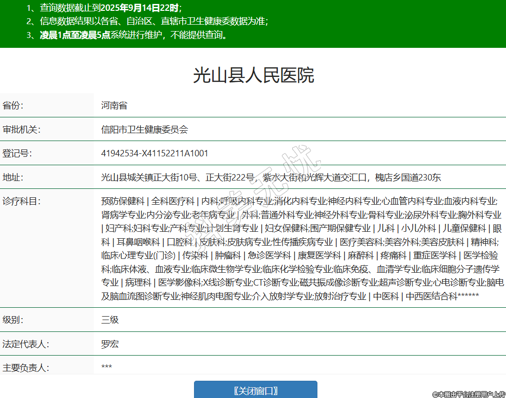 省份:河南省審批機(jī)關(guān):信陽市衛(wèi)生健康委員會登記號:41942534-X41152211A1001地址:光山縣城關(guān)鎮(zhèn)正大街10號、正大街222號,紫水大街和光輝大道交匯口,槐店鄉(xiāng)國道230東診療科目:預(yù)防保健科 | 全科醫(yī)療科 | 內(nèi)科;呼吸內(nèi)科專業(yè);消化內(nèi)科專業(yè);神經(jīng)內(nèi)科專業(yè);心血管內(nèi)科專業(yè);血液內(nèi)科專業(yè);腎病學(xué)專業(yè);內(nèi)分泌專業(yè);老年病專業(yè) | 外科;普通外科專業(yè);神經(jīng)外科專業(yè);骨科專業(yè);泌尿外科專業(yè);胸外科專業(yè) | 婦產(chǎn)科;婦科專業(yè);產(chǎn)科專業(yè);計劃生育專業(yè) | 婦女保健科;圍產(chǎn)期保健專業(yè) | 兒科 | 小兒外科 | 兒童保健科 | 眼科 | 耳鼻咽喉科 | 口腔科 | 皮膚科;皮膚病專業(yè);性傳播疾病專業(yè) | 醫(yī)療美容科;美容外科;美容皮膚科 | 精神科;臨床心理專業(yè)(門診) | 傳染科 | 腫瘤科 | 急診醫(yī)學(xué)科 | 康復(fù)醫(yī)學(xué)科 | 麻醉科 | 疼痛科 | 重癥醫(yī)學(xué)科 | 醫(yī)學(xué)檢驗科;臨床體液、血液專業(yè);臨床微生物學(xué)專業(yè);臨床化學(xué)檢驗專業(yè);臨床免疫、血清學(xué)專業(yè);臨床細(xì)胞分子遺傳學(xué)專業(yè) | 病理科 | 醫(yī)學(xué)影像科;X線診斷專業(yè);CT診斷專業(yè);磁共振成像診斷專業(yè);超聲診斷專業(yè);心電診斷專業(yè);腦電及腦血流圖診斷專業(yè);神經(jīng)肌肉電圖專業(yè);介入放射學(xué)專業(yè);放射治療專業(yè) | 中醫(yī)科 | 中西醫(yī)結(jié)合科******級別:三級法定代表人:羅宏主要負(fù)責(zé)人:***執(zhí)業(yè)許可證有效期:2025/04/22 -至- 2036/01/14 -
