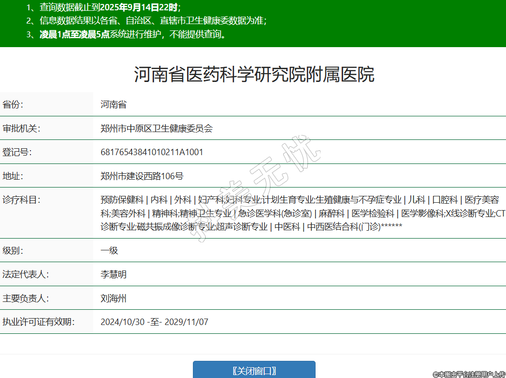 省份:河南省審批機關:鄭州市中原區(qū)衛(wèi)生健康委員會登記號:68176543841010211A1001地址:鄭州市建設西路106號診療科目:預防保健科 | 內(nèi)科 | 外科 | 婦產(chǎn)科;婦科專業(yè);計劃生育專業(yè);生殖健康與不孕癥專業(yè) | 兒科 | 口腔科 | 醫(yī)療美容科;美容外科 | 精神科;精神衛(wèi)生專業(yè) | 急診醫(yī)學科(急診室) | 麻醉科 | 醫(yī)學檢驗科 | 醫(yī)學影像科;X線診斷專業(yè);CT診斷專業(yè);磁共振成像診斷專業(yè);超聲診斷專業(yè) | 中醫(yī)科 | 中西醫(yī)結合科(門診)******級別:一級法定代表人:李慧明主要負責人:劉海州執(zhí)業(yè)許可證有效期:2024/10/30 -至- 2029/11/07 -