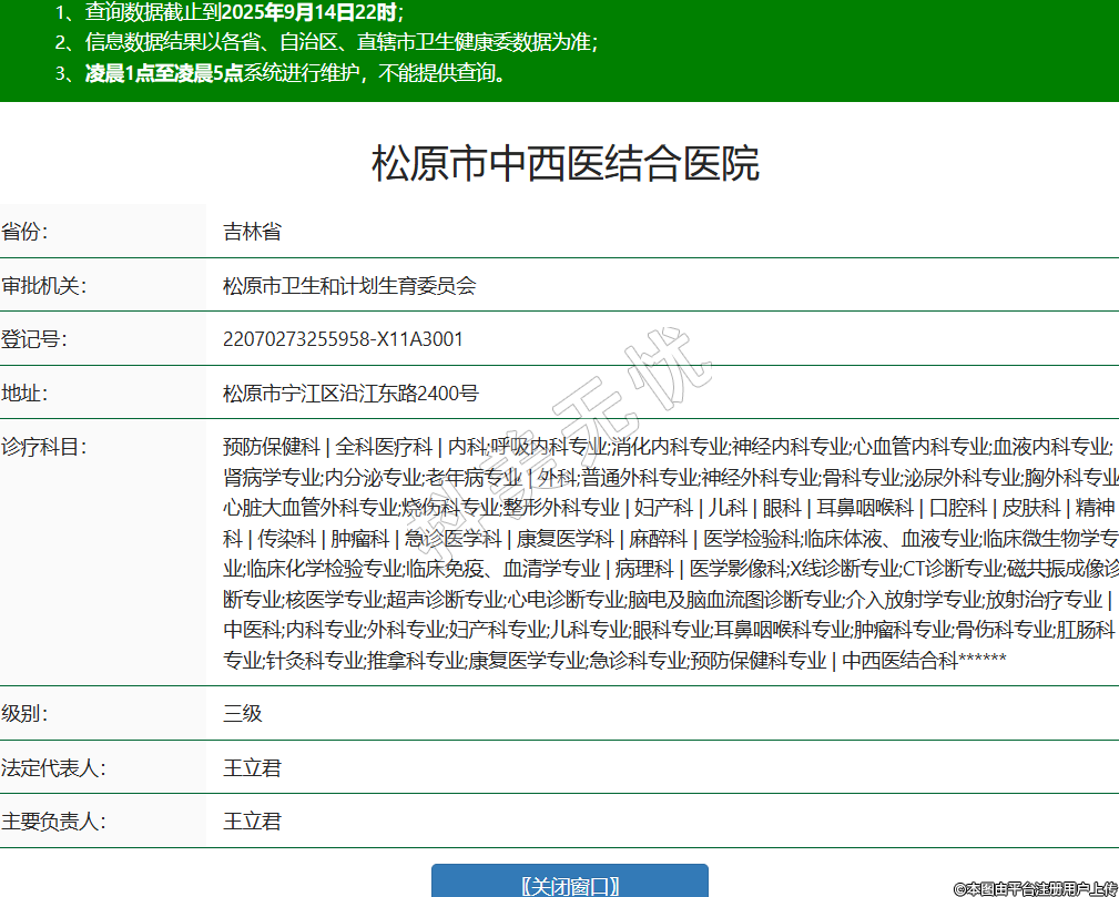 省份:吉林省審批機(jī)關(guān):松原市衛(wèi)生和計(jì)劃生育委員會(huì)登記號(hào):22070273255958-X11A3001地址:松原市寧江區(qū)沿江東路2400號(hào)診療科目:預(yù)防保健科 | 全科醫(yī)療科 | 內(nèi)科;呼吸內(nèi)科專業(yè);消化內(nèi)科專業(yè);神經(jīng)內(nèi)科專業(yè);心血管內(nèi)科專業(yè);血液內(nèi)科專業(yè);腎病學(xué)專業(yè);內(nèi)分泌專業(yè);老年病專業(yè) | 外科;普通外科專業(yè);神經(jīng)外科專業(yè);骨科專業(yè);泌尿外科專業(yè);胸外科專業(yè);心臟大血管外科專業(yè);燒傷科專業(yè);整形外科專業(yè) | 婦產(chǎn)科 | 兒科 | 眼科 | 耳鼻咽喉科 | 口腔科 | 皮膚科 | 精神科 | 傳染科 | 腫瘤科 | 急診醫(yī)學(xué)科 | 康復(fù)醫(yī)學(xué)科 | 麻醉科 | 醫(yī)學(xué)檢驗(yàn)科;臨床體液、血液專業(yè);臨床微生物學(xué)專業(yè);臨床化學(xué)檢驗(yàn)專業(yè);臨床免疫、血清學(xué)專業(yè) | 病理科 | 醫(yī)學(xué)影像科;X線診斷專業(yè);CT診斷專業(yè);磁共振成像診斷專業(yè);核醫(yī)學(xué)專業(yè);超聲診斷專業(yè);心電診斷專業(yè);腦電及腦血流圖診斷專業(yè);介入放射學(xué)專業(yè);放射治療專業(yè) | 中醫(yī)科;內(nèi)科專業(yè);外科專業(yè);婦產(chǎn)科專業(yè);兒科專業(yè);眼科專業(yè);耳鼻咽喉科專業(yè);腫瘤科專業(yè);骨傷科專業(yè);肛腸科專業(yè);針灸科專業(yè);推拿科專業(yè);康復(fù)醫(yī)學(xué)專業(yè);急診科專業(yè);預(yù)防保健科專業(yè) | 中西醫(yī)結(jié)合科******級(jí)別:三級(jí)法定代表人:王立君主要負(fù)責(zé)人:王立君執(zhí)業(yè)許可證有效期:2025/03/07 -至- 2036/05/31 -