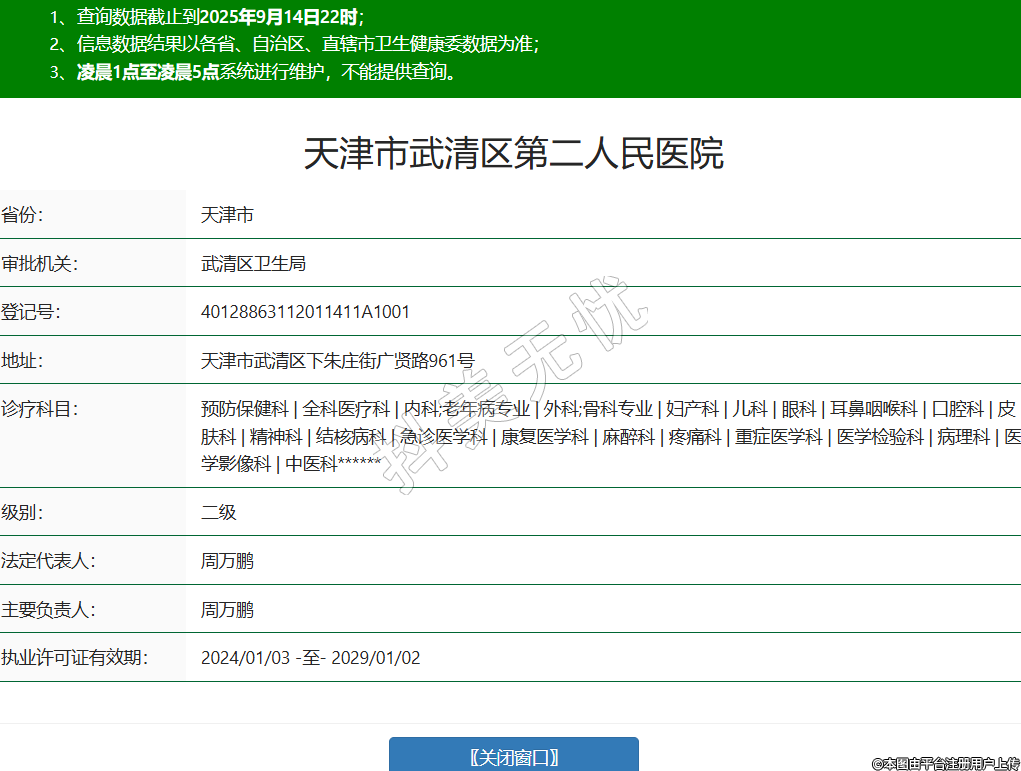 省份:天津市審批機關(guān):武清區(qū)衛(wèi)生局登記號:40128863112011411A1001地址:天津市武清區(qū)下朱莊街廣賢路961號診療科目:預(yù)防保健科 | 全科醫(yī)療科 | 內(nèi)科;老年病專業(yè) | 外科;骨科專業(yè) | 婦產(chǎn)科 | 兒科 | 眼科 | 耳鼻咽喉科 | 口腔科 | 皮膚科 | 精神科 | 結(jié)核病科 | 急診醫(yī)學(xué)科 | 康復(fù)醫(yī)學(xué)科 | 麻醉科 | 疼痛科 | 重癥醫(yī)學(xué)科 | 醫(yī)學(xué)檢驗科 | 病理科 | 醫(yī)學(xué)影像科 | 中醫(yī)科******級別:二級法定代表人:周萬鵬主要負責(zé)人:周萬鵬執(zhí)業(yè)許可證有效期:2024/01/03 -至- 2029/01/02 -