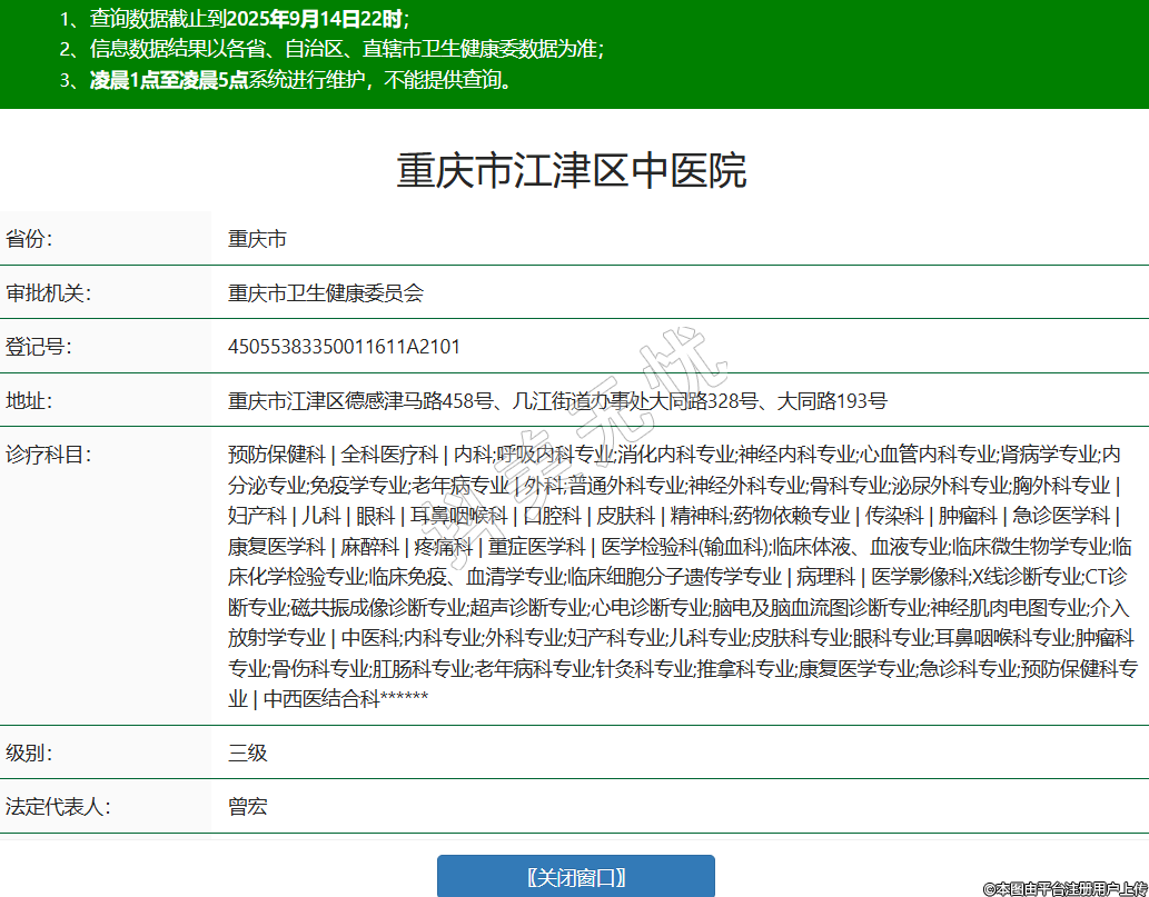 省份:重慶市審批機關(guān):重慶市衛(wèi)生健康委員會登記號:45055383350011611A2101地址:重慶市江津區(qū)德感津馬路458號、幾江街道辦事處大同路328號、大同路193號診療科目:預防保健科 | 全科醫(yī)療科 | 內(nèi)科;呼吸內(nèi)科專業(yè);消化內(nèi)科專業(yè);神經(jīng)內(nèi)科專業(yè);心血管內(nèi)科專業(yè);腎病學專業(yè);內(nèi)分泌專業(yè);免疫學專業(yè);老年病專業(yè) | 外科;普通外科專業(yè);神經(jīng)外科專業(yè);骨科專業(yè);泌尿外科專業(yè);胸外科專業(yè) | 婦產(chǎn)科 | 兒科 | 眼科 | 耳鼻咽喉科 | 口腔科 | 皮膚科 | 精神科;藥物依賴專業(yè) | 傳染科 | 腫瘤科 | 急診醫(yī)學科 | 康復醫(yī)學科 | 麻醉科 | 疼痛科 | 重癥醫(yī)學科 | 醫(yī)學檢驗科(輸血科);臨床體液、血液專業(yè);臨床微生物學專業(yè);臨床化學檢驗專業(yè);臨床免疫、血清學專業(yè);臨床細胞分子遺傳學專業(yè) | 病理科 | 醫(yī)學影像科;X線診斷專業(yè);CT診斷專業(yè);磁共振成像診斷專業(yè);超聲診斷專業(yè);心電診斷專業(yè);腦電及腦血流圖診斷專業(yè);神經(jīng)肌肉電圖專業(yè);介入放射學專業(yè) | 中醫(yī)科;內(nèi)科專業(yè);外科專業(yè);婦產(chǎn)科專業(yè);兒科專業(yè);皮膚科專業(yè);眼科專業(yè);耳鼻咽喉科專業(yè);腫瘤科專業(yè);骨傷科專業(yè);肛腸科專業(yè);老年病科專業(yè);針灸科專業(yè);推拿科專業(yè);康復醫(yī)學專業(yè);急診科專業(yè);預防保健科專業(yè) | 中西醫(yī)結(jié)合科******級別:三級法定代表人:曾宏主要負責人:曾宏執(zhí)業(yè)許可證有效期:2016/04/15 -至- 2031/04/14 -