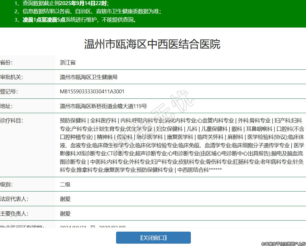 省份:浙江省審批機(jī)關(guān):溫州市甌海區(qū)衛(wèi)生健康局登記號(hào):MB155903333030411A3001地址:溫州市甌海區(qū)新橋街道金蟾大道119號(hào)診療科目:預(yù)防保健科 | 全科醫(yī)療科 | 內(nèi)科;呼吸內(nèi)科專業(yè);消化內(nèi)科專業(yè);心血管內(nèi)科專業(yè) | 外科;骨科專業(yè) | 婦產(chǎn)科;婦科專業(yè);產(chǎn)科專業(yè);計(jì)劃生育專業(yè);優(yōu)生學(xué)專業(yè) | 婦女保健科 | 兒科 | 兒童保健科 | 眼科 | 耳鼻咽喉科 | 口腔科(不含口腔種植專業(yè)) | 精神科 | 傳染科 | 急診醫(yī)學(xué)科 | 康復(fù)醫(yī)學(xué)科 | 臨終關(guān)懷科 | 麻醉科 | 醫(yī)學(xué)檢驗(yàn)科(協(xié)議);臨床體液、血液專業(yè);臨床微生物學(xué)專業(yè);臨床化學(xué)檢驗(yàn)專業(yè);臨床免疫、血清學(xué)專業(yè);臨床細(xì)胞分子遺傳學(xué)專業(yè) | 醫(yī)學(xué)影像科;X線診斷專業(yè);CT診斷專業(yè);超聲診斷專業(yè);心電診斷專業(yè)(由區(qū)域心電診斷中心出具報(bào)告);腦電及腦血流圖診斷專業(yè) | 中醫(yī)科;內(nèi)科專業(yè);外科專業(yè);婦產(chǎn)科專業(yè);皮膚科專業(yè);骨傷科專業(yè);肛腸科專業(yè);老年病科專業(yè);針灸科專業(yè);推拿科專業(yè);康復(fù)醫(yī)學(xué)專業(yè);預(yù)防保健科專業(yè) | 中西醫(yī)結(jié)合科******級(jí)別:二級(jí)法定代表人:謝愛主要負(fù)責(zé)人:謝愛執(zhí)業(yè)許可證有效期:2024/10/31 -至- 2030/03/08 -