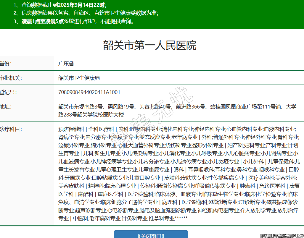 省份:廣東省審批機關:韶關市衛(wèi)生健康局登記號:70809084944020411A1001地址:韶關市東堤南路3號、熏風路19號、芙蓉北路40號、前進路366號、碧桂園鳳凰商業(yè)廣場第111號鋪、大學路288號韶關學院校醫(yī)院大樓診療科目:預防保健科 | 全科醫(yī)療科 | 內(nèi)科;呼吸內(nèi)科專業(yè);消化內(nèi)科專業(yè);神經(jīng)內(nèi)科專業(yè);心血管內(nèi)科專業(yè);血液內(nèi)科專業(yè);腎病學專業(yè);內(nèi)分泌專業(yè);免疫學專業(yè);變態(tài)反應專業(yè);老年病專業(yè) | 外科;普通外科專業(yè);神經(jīng)外科專業(yè);骨科專業(yè);泌尿外科專業(yè);胸外科專業(yè);心臟大血管外科專業(yè);燒傷科專業(yè);整形外科專業(yè) | 婦產(chǎn)科;婦科專業(yè);產(chǎn)科專業(yè);計劃生育專業(yè) | 兒科;新生兒專業(yè);小兒傳染病專業(yè);小兒消化專業(yè);小兒呼吸專業(yè);小兒心臟病專業(yè);小兒腎病專業(yè);小兒血液病專業(yè);小兒神經(jīng)病學專業(yè);小兒內(nèi)分泌專業(yè);小兒遺傳病專業(yè);小兒免疫專業(yè) | 小兒外科 | 兒童保健科;兒童生長發(fā)育專業(yè);兒童心理衛(wèi)生專業(yè);兒童康復專業(yè) | 眼科 | 耳鼻咽喉科;耳科專業(yè);鼻科專業(yè);咽喉科專業(yè) | 口腔科;牙周病專業(yè);口腔粘膜病專業(yè);兒童口腔專業(yè) | 皮膚科;皮膚病專業(yè);性傳播疾病專業(yè) | 醫(yī)療美容科;美容外科;美容皮膚科 | 精神科;臨床心理專業(yè) | 傳染科;腸道傳染病專業(yè);呼吸道傳染病專業(yè) | 腫瘤科 | 急診醫(yī)學科 | 康復醫(yī)學科 | 麻醉科 | 重癥醫(yī)學科 | 醫(yī)學檢驗科;臨床體液、血液專業(yè);臨床微生物學專業(yè);臨床化學檢驗專業(yè);臨床免疫、血清學專業(yè);臨床細胞分子遺傳學專業(yè) | 病理科 | 醫(yī)學影像科;X線診斷專業(yè);CT診斷專業(yè);磁共振成像診斷專業(yè);超聲診斷專業(yè);心電診斷專業(yè);腦電及腦血流圖診斷專業(yè);神經(jīng)肌肉電圖專業(yè);介入放射學專業(yè);放射治療專業(yè) | 中醫(yī)科;老年病科專業(yè);針灸科專業(yè);推拿科專業(yè)******級別:三級法定代表人:吳強主要負責人:吳強執(zhí)業(yè)許可證有效期:2025/05/26 -至- 2026/12/31 -