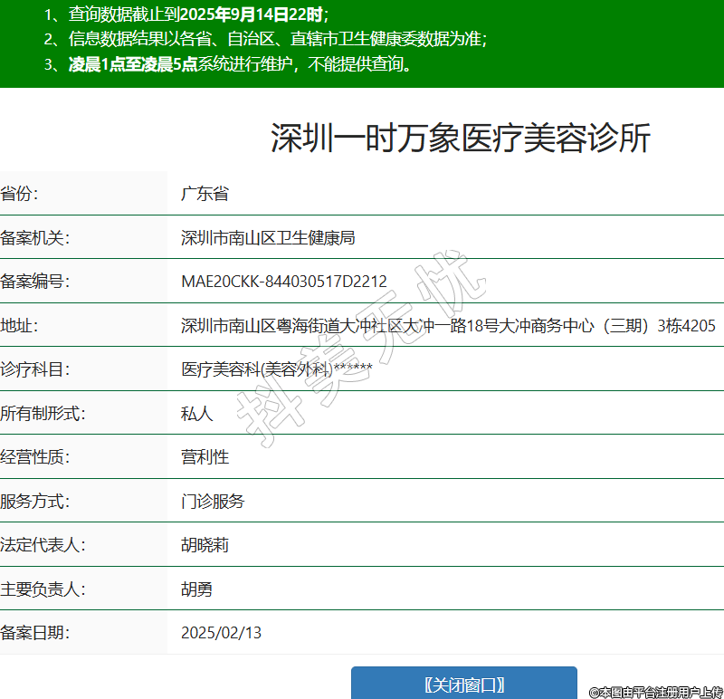 省份:廣東省備案機(jī)關(guān):深圳市南山區(qū)衛(wèi)生健康局備案編號(hào):MAE20CKK-844030517D2212地址:深圳市南山區(qū)粵海街道大沖社區(qū)大沖一路18號(hào)大沖商務(wù)中心(三期)3棟4205診療科目:醫(yī)療美容科(美容外科)******所有制形式:私人經(jīng)營(yíng)性質(zhì):營(yíng)利性服務(wù)方式:門(mén)診服務(wù)法定代表人:胡曉莉主要負(fù)責(zé)人:胡勇備案日期:2025/02/13 -