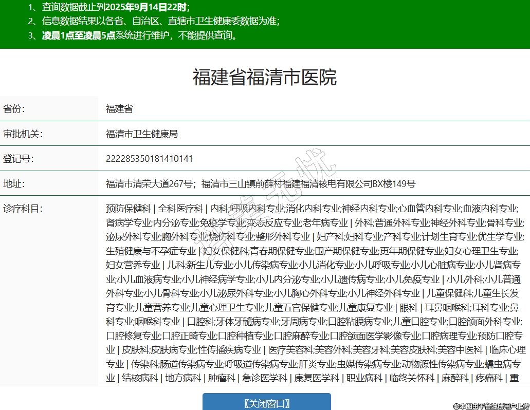 省份:福建省審批機關:福清市衛(wèi)生健康局登記號:222285350181410141地址:福清市清榮大道267號;福清市三山鎮(zhèn)前薛村福建福清核電有限公司BX樓149號診療科目:預防保健科 | 全科醫(yī)療科 | 內(nèi)科;呼吸內(nèi)科專業(yè);消化內(nèi)科專業(yè);神經(jīng)內(nèi)科專業(yè);心血管內(nèi)科專業(yè);血液內(nèi)科專業(yè);腎病學專業(yè);內(nèi)分泌專業(yè);免疫學專業(yè);變態(tài)反應專業(yè);老年病專業(yè) | 外科;普通外科專業(yè);神經(jīng)外科專業(yè);骨科專業(yè);泌尿外科專業(yè);胸外科專業(yè);燒傷科專業(yè);整形外科專業(yè) | 婦產(chǎn)科;婦科專業(yè);產(chǎn)科專業(yè);計劃生育專業(yè);優(yōu)生學專業(yè);生殖健康與不孕癥專業(yè) | 婦女保健科;青春期保健專業(yè);圍產(chǎn)期保健專業(yè);更年期保健專業(yè);婦女心理衛(wèi)生專業(yè);婦女營養(yǎng)專業(yè) | 兒科;新生兒專業(yè);小兒傳染病專業(yè);小兒消化專業(yè);小兒呼吸專業(yè);小兒心臟病專業(yè);小兒腎病專業(yè);小兒血液病專業(yè);小兒神經(jīng)病學專業(yè);小兒內(nèi)分泌專業(yè);小兒遺傳病專業(yè);小兒免疫專業(yè) | 小兒外科;小兒普通外科專業(yè);小兒骨科專業(yè);小兒泌尿外科專業(yè);小兒胸心外科專業(yè);小兒神經(jīng)外科專業(yè) | 兒童保健科;兒童生長發(fā)育專業(yè);兒童營養(yǎng)專業(yè);兒童心理衛(wèi)生專業(yè);兒童五官保健專業(yè);兒童康復專業(yè) | 眼科 | 耳鼻咽喉科;耳科專業(yè);鼻科專業(yè);咽喉科專業(yè) | 口腔科;牙體牙髓病專業(yè);牙周病專業(yè);口腔粘膜病專業(yè);兒童口腔專業(yè);口腔頜面外科專業(yè);口腔修復專業(yè);口腔正畸專業(yè);口腔種植專業(yè);口腔麻醉專業(yè);口腔頜面醫(yī)學影像專業(yè);口腔病理專業(yè);預防口腔專業(yè) | 皮膚科;皮膚病專業(yè);性傳播疾病專業(yè) | 醫(yī)療美容科;美容外科;美容牙科;美容皮膚科;美容中醫(yī)科 | 臨床心理專業(yè) | 傳染科;腸道傳染病專業(yè);呼吸道傳染病專業(yè);肝炎專業(yè);蟲媒傳染病專業(yè);動物源性傳染病專業(yè);蠕蟲病專業(yè) | 結核病科 | 地方病科 | 腫瘤科 | 急診醫(yī)學科 | 康復醫(yī)學科 | 職業(yè)病科 | 臨終關懷科 | 麻醉科 | 疼痛科 | 重癥醫(yī)學科 | 醫(yī)學檢驗科;臨床體液、血液專業(yè);臨床微生物學專業(yè);臨床化學檢驗專業(yè);臨床免疫、血清學專業(yè);臨床細胞分子遺傳學專業(yè) | 病理科 | 醫(yī)學影像科;X線診斷專業(yè);CT診斷專業(yè);磁共振成像診斷專業(yè);核醫(yī)學專業(yè);超聲診斷專業(yè);心電診斷專業(yè);腦電及腦血流圖診斷專業(yè);神經(jīng)肌肉電圖專業(yè);介入放射學專業(yè) | 中醫(yī)科;內(nèi)科專業(yè);外科專業(yè);婦產(chǎn)科專業(yè);兒科專業(yè);皮膚科專業(yè);眼科專業(yè);耳鼻咽喉科專業(yè);口腔科專業(yè);腫瘤科專業(yè);骨傷科專業(yè);肛腸科專業(yè);老年病科專業(yè);針灸科專業(yè);推拿科專業(yè);康復醫(yī)學專業(yè);急診科專業(yè);預防保健科專業(yè) | 中西醫(yī)結合科******級別:三級法定代表人:林仕忠主要負責人:林仕忠執(zhí)業(yè)許可證有效期:2023/03/29 -至- 2029/03/28 -