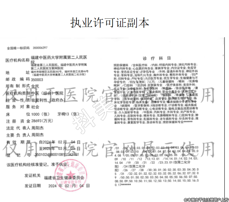 省份:福建省審批機關:福建省衛(wèi)生健康委員會登記號:35010248800108111A2101地址:福州市鼓樓區(qū)五四路282號,福州市連江北路46號(福建中醫(yī)藥大學附屬第二人民醫(yī)院二化分院)診療科目:預防保健科 | 全科醫(yī)療科 | 內(nèi)科;呼吸內(nèi)科專業(yè);消化內(nèi)科專業(yè);神經(jīng)內(nèi)科專業(yè);心血管內(nèi)科專業(yè);腎病學專業(yè);內(nèi)分泌專業(yè);免疫學專業(yè);變態(tài)反應專業(yè);老年病專業(yè) | 外科;普通外科專業(yè);神經(jīng)外科專業(yè);骨科專業(yè);泌尿外科專業(yè);胸外科專業(yè);整形外科專業(yè) | 婦產(chǎn)科;婦科專業(yè);產(chǎn)科專業(yè);計劃生育專業(yè);優(yōu)生學專業(yè);生殖健康與不孕癥專業(yè) | 婦女保健科 | 兒科 | 兒童保健科 | 眼科 | 耳鼻咽喉科 | 口腔科 | 皮膚科;皮膚病專業(yè) | 醫(yī)療美容科;美容外科;美容牙科;美容皮膚科;美容中醫(yī)科 | 腫瘤科 | 急診醫(yī)學科 | 康復醫(yī)學科 | 運動醫(yī)學科 | 職業(yè)病科;職業(yè)中毒專業(yè)(僅限二化分院) | 臨終關懷科(僅限二化分院) | 麻醉科 | 疼痛科 | 重癥醫(yī)學科 | 醫(yī)學檢驗科;臨床體液、血液專業(yè);臨床微生物學專業(yè);臨床化學檢驗專業(yè);臨床免疫、血清學專業(yè);臨床細胞分子遺傳學專業(yè) | 病理科 | 醫(yī)學影像科;X線診斷專業(yè);CT診斷專業(yè);磁共振成像診斷專業(yè);超聲診斷專業(yè);心電診斷專業(yè);腦電及腦血流圖診斷專業(yè);介入放射學專業(yè) | 中醫(yī)科;內(nèi)科專業(yè);外科專業(yè);婦產(chǎn)科專業(yè);兒科專業(yè);皮膚科專業(yè);眼科專業(yè);耳鼻咽喉科專業(yè);口腔科專業(yè);腫瘤科專業(yè);骨傷科專業(yè);肛腸科專業(yè);老年病科專業(yè);針灸科專業(yè);推拿科專業(yè);康復醫(yī)學專業(yè);急診科專業(yè);預防保健科專業(yè)******級別:三級法定代表人:周陽杰主要負責人:周陽杰執(zhí)業(yè)許可證有效期:2025/04/03 -至- 2026/03/25 -