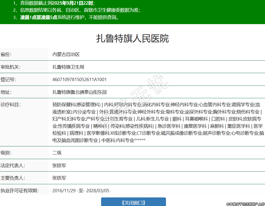 省份:內(nèi)蒙古自治區(qū)審批機關(guān):扎魯特旗衛(wèi)生局登記號:46071097815052611A1001地址:扎魯特旗魯北鎮(zhèn)泰山街東段診療科目:預(yù)防保健科(感染管理科) | 內(nèi)科;呼吸內(nèi)科專業(yè);消化內(nèi)科專業(yè);神經(jīng)內(nèi)科專業(yè);心血管內(nèi)科專業(yè);腎病學(xué)專業(yè)(血液透析室);內(nèi)分泌專業(yè) | 外科;普通外科專業(yè);神經(jīng)外科專業(yè);骨科專業(yè);泌尿外科專業(yè);胸外科專業(yè);燒傷科專業(yè) | 婦產(chǎn)科;婦科專業(yè);產(chǎn)科專業(yè);計劃生育專業(yè) | 兒科;新生兒專業(yè) | 眼科 | 耳鼻咽喉科 | 口腔科 | 皮膚科;皮膚病專業(yè);性傳播疾病專業(yè) | 精神科 | 傳染科(感染性疾病科) | 急診醫(yī)學(xué)科 | 康復(fù)醫(yī)學(xué)科 | 麻醉科 | 重癥醫(yī)學(xué)科 | 醫(yī)學(xué)檢驗科 | 病理科 | 醫(yī)學(xué)影像科;X線診斷專業(yè);CT診斷專業(yè);磁共振成像診斷專業(yè);超聲診斷專業(yè);心電診斷專業(yè);腦電及腦血流圖診斷專業(yè) | 中醫(yī)科;內(nèi)科專業(yè)******級別:二級法定代表人:張鐵軍主要負(fù)責(zé)人:張鐵軍執(zhí)業(yè)許可證有效期:2016/11/29 -至- 2028/03/05 -