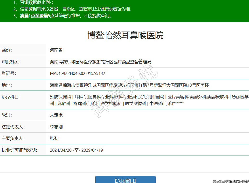 省份:海南省審批機(jī)關(guān):海南博鰲樂城國際醫(yī)療旅游先行區(qū)醫(yī)療藥品監(jiān)督管理局登記號(hào):MACC9M2H046000015A5132地址:海南省瓊海市博鰲鎮(zhèn)樂城國際醫(yī)療旅游先行區(qū)康祥路7號(hào)博鰲恒大國際醫(yī)院13號(hào)醫(yī)美樓診療科目:預(yù)防保健科 | 耳科專業(yè);鼻科專業(yè);咽喉科專業(yè);其他(頭頸腫瘤科) | 醫(yī)療美容科;美容外科;美容皮膚科 | 急診醫(yī)學(xué)科 | 麻醉科 | 疼痛科(門診) | 醫(yī)學(xué)檢驗(yàn)科 | 醫(yī)學(xué)影像科 | 中醫(yī)科(門診)******級(jí)別:未定級(jí)法定代表人:李志剛主要負(fù)責(zé)人:張勁執(zhí)業(yè)許可證有效期:2024/04/20 -至- 2029/04/19 -