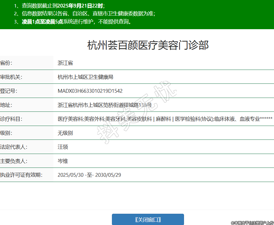 省份:浙江省審批機(jī)關(guān):杭州市上城區(qū)衛(wèi)生健康局登記號(hào):MADX03H6633010219D1542地址:浙江省杭州市上城區(qū)筧橋街道驛城路138號(hào)診療科目:醫(yī)療美容科;美容外科;美容牙科;美容皮膚科 | 麻醉科 | 醫(yī)學(xué)檢驗(yàn)科(協(xié)議);臨床體液、血液專業(yè)******級(jí)別:無(wú)級(jí)別法定代表人:汪領(lǐng)主要負(fù)責(zé)人:岑維執(zhí)業(yè)許可證有效期:2025/05/30 -至- 2030/05/29 -