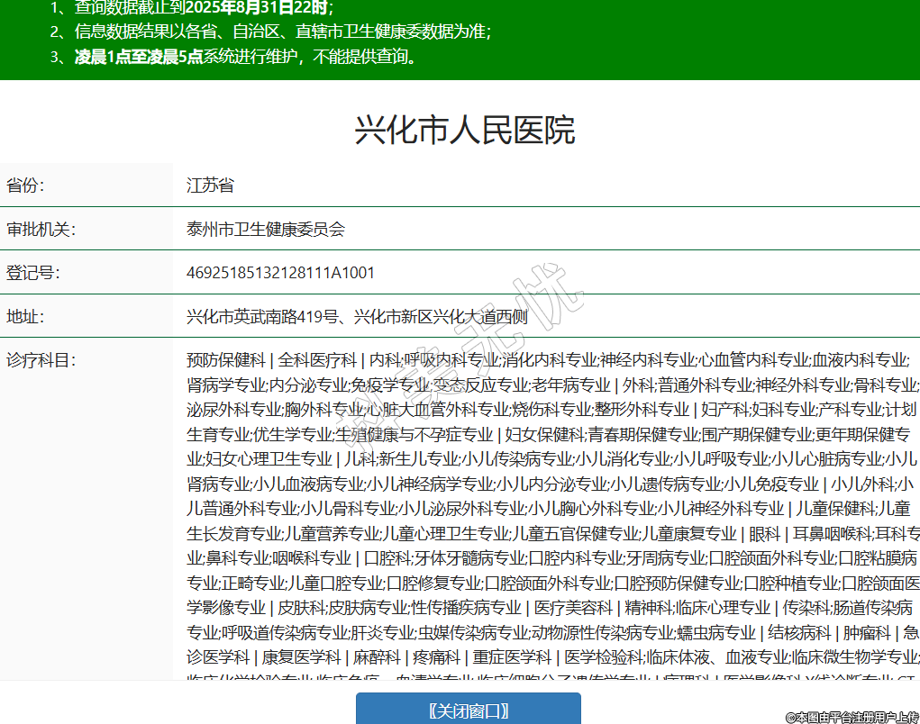 省份:江蘇省審批機(jī)關(guān):泰州市衛(wèi)生健康委員會登記號:46925185132128111A1001地址:興化市英武南路419號、興化市新區(qū)興化大道西側(cè)診療科目:預(yù)防保健科 | 全科醫(yī)療科 | 內(nèi)科;呼吸內(nèi)科專業(yè);消化內(nèi)科專業(yè);神經(jīng)內(nèi)科專業(yè);心血管內(nèi)科專業(yè);血液內(nèi)科專業(yè);腎病學(xué)專業(yè);內(nèi)分泌專業(yè);免疫學(xué)專業(yè);變態(tài)反應(yīng)專業(yè);老年病專業(yè) | 外科;普通外科專業(yè);神經(jīng)外科專業(yè);骨科專業(yè);泌尿外科專業(yè);胸外科專業(yè);心臟大血管外科專業(yè);燒傷科專業(yè);整形外科專業(yè) | 婦產(chǎn)科;婦科專業(yè);產(chǎn)科專業(yè);計劃生育專業(yè);優(yōu)生學(xué)專業(yè);生殖健康與不孕癥專業(yè) | 婦女保健科;青春期保健專業(yè);圍產(chǎn)期保健專業(yè);更年期保健專業(yè);婦女心理衛(wèi)生專業(yè) | 兒科;新生兒專業(yè);小兒傳染病專業(yè);小兒消化專業(yè);小兒呼吸專業(yè);小兒心臟病專業(yè);小兒腎病專業(yè);小兒血液病專業(yè);小兒神經(jīng)病學(xué)專業(yè);小兒內(nèi)分泌專業(yè);小兒遺傳病專業(yè);小兒免疫專業(yè) | 小兒外科;小兒普通外科專業(yè);小兒骨科專業(yè);小兒泌尿外科專業(yè);小兒胸心外科專業(yè);小兒神經(jīng)外科專業(yè) | 兒童保健科;兒童生長發(fā)育專業(yè);兒童營養(yǎng)專業(yè);兒童心理衛(wèi)生專業(yè);兒童五官保健專業(yè);兒童康復(fù)專業(yè) | 眼科 | 耳鼻咽喉科;耳科專業(yè);鼻科專業(yè);咽喉科專業(yè) | 口腔科;牙體牙髓病專業(yè);口腔內(nèi)科專業(yè);牙周病專業(yè);口腔頜面外科專業(yè);口腔粘膜病專業(yè);正畸專業(yè);兒童口腔專業(yè);口腔修復(fù)專業(yè);口腔頜面外科專業(yè);口腔預(yù)防保健專業(yè);口腔種植專業(yè);口腔頜面醫(yī)學(xué)影像專業(yè) | 皮膚科;皮膚病專業(yè);性傳播疾病專業(yè) | 醫(yī)療美容科 | 精神科;臨床心理專業(yè) | 傳染科;腸道傳染病專業(yè);呼吸道傳染病專業(yè);肝炎專業(yè);蟲媒傳染病專業(yè);動物源性傳染病專業(yè);蠕蟲病專業(yè) | 結(jié)核病科 | 腫瘤科 | 急診醫(yī)學(xué)科 | 康復(fù)醫(yī)學(xué)科 | 麻醉科 | 疼痛科 | 重癥醫(yī)學(xué)科 | 醫(yī)學(xué)檢驗(yàn)科;臨床體液、血液專業(yè);臨床微生物學(xué)專業(yè);臨床化學(xué)檢驗(yàn)專業(yè);臨床免疫、血清學(xué)專業(yè);臨床細(xì)胞分子遺傳學(xué)專業(yè) | 病理科 | 醫(yī)學(xué)影像科;X線診斷專業(yè);CT診斷專業(yè);磁共振成像診斷專業(yè);核醫(yī)學(xué)專業(yè);超聲診斷專業(yè);心電診斷專業(yè);腦電及腦血流圖診斷專業(yè);神經(jīng)肌肉電圖專業(yè);介入放射學(xué)專業(yè);放射治療專業(yè) | 中醫(yī)科;內(nèi)科專業(yè);外科專業(yè);婦產(chǎn)科專業(yè);兒科專業(yè);皮膚科專業(yè);腫瘤科專業(yè);骨傷科專業(yè);肛腸科專業(yè);老年病科專業(yè);針灸科專業(yè);推拿科專業(yè);康復(fù)醫(yī)學(xué)專業(yè);預(yù)防保健科專業(yè) | 中西醫(yī)結(jié)合科******級別:三級法定代表人:鄧新桃主要負(fù)責(zé)人:鄧新桃執(zhí)業(yè)許可證有效期:2022/07/20 -至- 2037/07/19 -