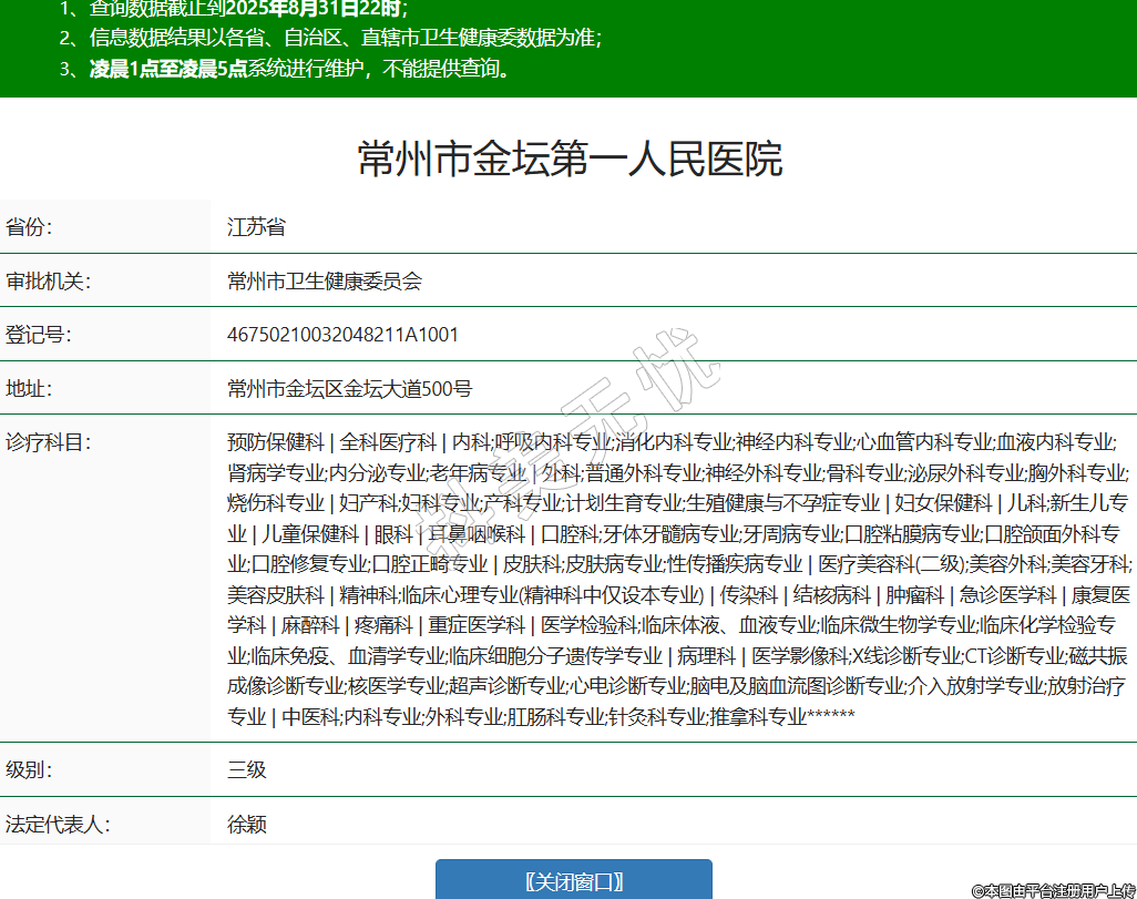 省份:江蘇省審批機關(guān):常州市衛(wèi)生健康委員會登記號:46750210032048211A1001地址:常州市金壇區(qū)金壇大道500號診療科目:預(yù)防保健科 | 全科醫(yī)療科 | 內(nèi)科;呼吸內(nèi)科專業(yè);消化內(nèi)科專業(yè);神經(jīng)內(nèi)科專業(yè);心血管內(nèi)科專業(yè);血液內(nèi)科專業(yè);腎病學(xué)專業(yè);內(nèi)分泌專業(yè);老年病專業(yè) | 外科;普通外科專業(yè);神經(jīng)外科專業(yè);骨科專業(yè);泌尿外科專業(yè);胸外科專業(yè);燒傷科專業(yè) | 婦產(chǎn)科;婦科專業(yè);產(chǎn)科專業(yè);計劃生育專業(yè);生殖健康與不孕癥專業(yè) | 婦女保健科 | 兒科;新生兒專業(yè) | 兒童保健科 | 眼科 | 耳鼻咽喉科 | 口腔科;牙體牙髓病專業(yè);牙周病專業(yè);口腔粘膜病專業(yè);口腔頜面外科專業(yè);口腔修復(fù)專業(yè);口腔正畸專業(yè) | 皮膚科;皮膚病專業(yè);性傳播疾病專業(yè) | 醫(yī)療美容科(二級);美容外科;美容牙科;美容皮膚科 | 精神科;臨床心理專業(yè)(精神科中僅設(shè)本專業(yè)) | 傳染科 | 結(jié)核病科 | 腫瘤科 | 急診醫(yī)學(xué)科 | 康復(fù)醫(yī)學(xué)科 | 麻醉科 | 疼痛科 | 重癥醫(yī)學(xué)科 | 醫(yī)學(xué)檢驗科;臨床體液、血液專業(yè);臨床微生物學(xué)專業(yè);臨床化學(xué)檢驗專業(yè);臨床免疫、血清學(xué)專業(yè);臨床細(xì)胞分子遺傳學(xué)專業(yè) | 病理科 | 醫(yī)學(xué)影像科;X線診斷專業(yè);CT診斷專業(yè);磁共振成像診斷專業(yè);核醫(yī)學(xué)專業(yè);超聲診斷專業(yè);心電診斷專業(yè);腦電及腦血流圖診斷專業(yè);介入放射學(xué)專業(yè);放射治療專業(yè) | 中醫(yī)科;內(nèi)科專業(yè);外科專業(yè);肛腸科專業(yè);針灸科專業(yè);推拿科專業(yè)******級別:三級法定代表人:徐穎主要負(fù)責(zé)人:徐穎執(zhí)業(yè)許可證有效期:2024/01/18 -至- 2034/12/24 -