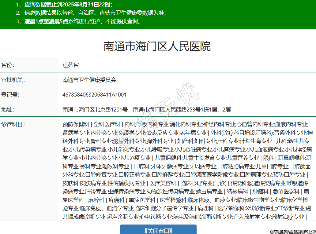 省份:江蘇省審批機(jī)關(guān):南通市衛(wèi)生健康委員會登記號:46785840632068411A1001地址:南通市海門區(qū)北京路1201號,南通市海門區(qū)人民西路253號1棟1層、2層診療科目:預(yù)防保健科 | 全科醫(yī)療科 | 內(nèi)科;呼吸內(nèi)科專業(yè);消化內(nèi)科專業(yè);神經(jīng)內(nèi)科專業(yè);心血管內(nèi)科專業(yè);血液內(nèi)科專業(yè);腎病學(xué)專業(yè);內(nèi)分泌專業(yè);免疫學(xué)專業(yè);變態(tài)反應(yīng)專業(yè);老年病專業(yè) | 外科(診療科目增設(shè)肛腸科);普通外科專業(yè);神經(jīng)外科專業(yè);骨科專業(yè);泌尿外科專業(yè);胸外科專業(yè) | 婦產(chǎn)科;婦科專業(yè);產(chǎn)科專業(yè);計劃生育專業(yè) | 兒科;新生兒專業(yè);小兒傳染病專業(yè);小兒消化專業(yè);小兒呼吸專業(yè);小兒心臟病專業(yè);小兒腎病專業(yè);小兒血液病專業(yè);小兒神經(jīng)病學(xué)專業(yè);小兒內(nèi)分泌專業(yè);小兒免疫專業(yè) | 兒童保健科;兒童生長發(fā)育專業(yè);兒童營養(yǎng)專業(yè) | 眼科 | 耳鼻咽喉科;耳科專業(yè);鼻科專業(yè);咽喉科專業(yè) | 口腔科;牙體牙髓病專業(yè);牙周病專業(yè);口腔粘膜病專業(yè);兒童口腔專業(yè);口腔頜面外科專業(yè);口腔修復(fù)專業(yè);口腔正畸專業(yè);口腔麻醉專業(yè);口腔頜面醫(yī)學(xué)影像專業(yè);口腔病理專業(yè);預(yù)防口腔專業(yè) | 皮膚科;皮膚病專業(yè);性傳播疾病專業(yè) | 醫(yī)療美容科 | 臨床心理專業(yè)(門診) | 傳染科;腸道傳染病專業(yè);呼吸道傳染病專業(yè);肝炎專業(yè);蟲媒傳染病專業(yè);動物源性傳染病專業(yè);蠕蟲病專業(yè) | 結(jié)核病科 | 腫瘤科 | 急診醫(yī)學(xué)科 | 康復(fù)醫(yī)學(xué)科 | 麻醉科 | 疼痛科 | 重癥醫(yī)學(xué)科 | 醫(yī)學(xué)檢驗(yàn)科;臨床體液、血液專業(yè);臨床微生物學(xué)專業(yè);臨床化學(xué)檢驗(yàn)專業(yè);臨床免疫、血清學(xué)專業(yè);臨床細(xì)胞分子遺傳學(xué)專業(yè) | 病理科 | 醫(yī)學(xué)影像科;X線診斷專業(yè);CT診斷專業(yè);磁共振成像診斷專業(yè);超聲診斷專業(yè);心電診斷專業(yè);腦電及腦血流圖診斷專業(yè);介入放射學(xué)專業(yè);放射治療專業(yè) | 中醫(yī)科;內(nèi)科專業(yè);婦產(chǎn)科專業(yè);肛腸科專業(yè);針灸科專業(yè);推拿科專業(yè) | 中西醫(yī)結(jié)合科******級別:三級法定代表人:姜新峰主要負(fù)責(zé)人:江琳執(zhí)業(yè)許可證有效期:2023/10/07 -至- 2036/03/14 -
