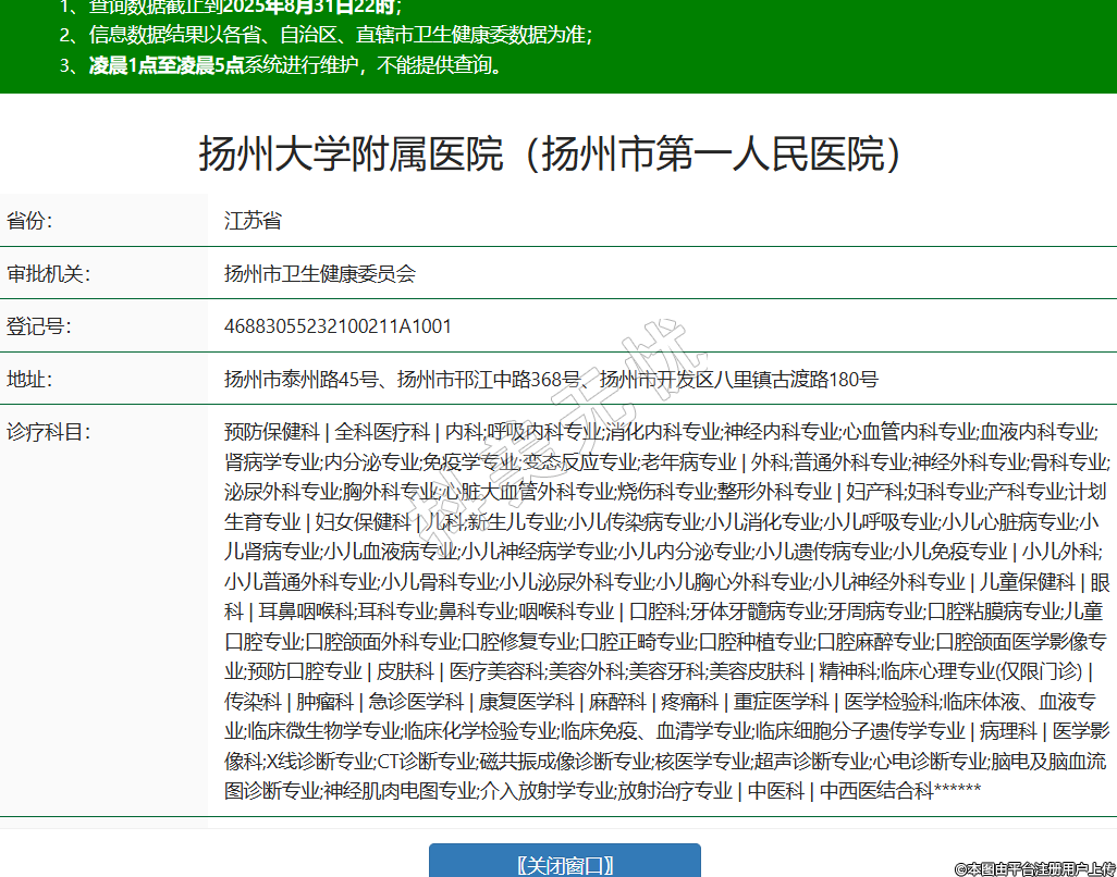 省份:江蘇省審批機(jī)關(guān):揚(yáng)州市衛(wèi)生健康委員會登記號:46883055232100211A1001地址:揚(yáng)州市泰州路45號、揚(yáng)州市邗江中路368號、揚(yáng)州市開發(fā)區(qū)八里鎮(zhèn)古渡路180號診療科目:預(yù)防保健科 | 全科醫(yī)療科 | 內(nèi)科;呼吸內(nèi)科專業(yè);消化內(nèi)科專業(yè);神經(jīng)內(nèi)科專業(yè);心血管內(nèi)科專業(yè);血液內(nèi)科專業(yè);腎病學(xué)專業(yè);內(nèi)分泌專業(yè);免疫學(xué)專業(yè);變態(tài)反應(yīng)專業(yè);老年病專業(yè) | 外科;普通外科專業(yè);神經(jīng)外科專業(yè);骨科專業(yè);泌尿外科專業(yè);胸外科專業(yè);心臟大血管外科專業(yè);燒傷科專業(yè);整形外科專業(yè) | 婦產(chǎn)科;婦科專業(yè);產(chǎn)科專業(yè);計劃生育專業(yè) | 婦女保健科 | 兒科;新生兒專業(yè);小兒傳染病專業(yè);小兒消化專業(yè);小兒呼吸專業(yè);小兒心臟病專業(yè);小兒腎病專業(yè);小兒血液病專業(yè);小兒神經(jīng)病學(xué)專業(yè);小兒內(nèi)分泌專業(yè);小兒遺傳病專業(yè);小兒免疫專業(yè) | 小兒外科;小兒普通外科專業(yè);小兒骨科專業(yè);小兒泌尿外科專業(yè);小兒胸心外科專業(yè);小兒神經(jīng)外科專業(yè) | 兒童保健科 | 眼科 | 耳鼻咽喉科;耳科專業(yè);鼻科專業(yè);咽喉科專業(yè) | 口腔科;牙體牙髓病專業(yè);牙周病專業(yè);口腔粘膜病專業(yè);兒童口腔專業(yè);口腔頜面外科專業(yè);口腔修復(fù)專業(yè);口腔正畸專業(yè);口腔種植專業(yè);口腔麻醉專業(yè);口腔頜面醫(yī)學(xué)影像專業(yè);預(yù)防口腔專業(yè) | 皮膚科 | 醫(yī)療美容科;美容外科;美容牙科;美容皮膚科 | 精神科;臨床心理專業(yè)(僅限門診) | 傳染科 | 腫瘤科 | 急診醫(yī)學(xué)科 | 康復(fù)醫(yī)學(xué)科 | 麻醉科 | 疼痛科 | 重癥醫(yī)學(xué)科 | 醫(yī)學(xué)檢驗科;臨床體液、血液專業(yè);臨床微生物學(xué)專業(yè);臨床化學(xué)檢驗專業(yè);臨床免疫、血清學(xué)專業(yè);臨床細(xì)胞分子遺傳學(xué)專業(yè) | 病理科 | 醫(yī)學(xué)影像科;X線診斷專業(yè);CT診斷專業(yè);磁共振成像診斷專業(yè);核醫(yī)學(xué)專業(yè);超聲診斷專業(yè);心電診斷專業(yè);腦電及腦血流圖診斷專業(yè);神經(jīng)肌肉電圖專業(yè);介入放射學(xué)專業(yè);放射治療專業(yè) | 中醫(yī)科 | 中西醫(yī)結(jié)合科******級別:三級法定代表人:龔開政主要負(fù)責(zé)人:龔開政執(zhí)業(yè)許可證有效期:2025/08/26 -至- 2036/01/24 -