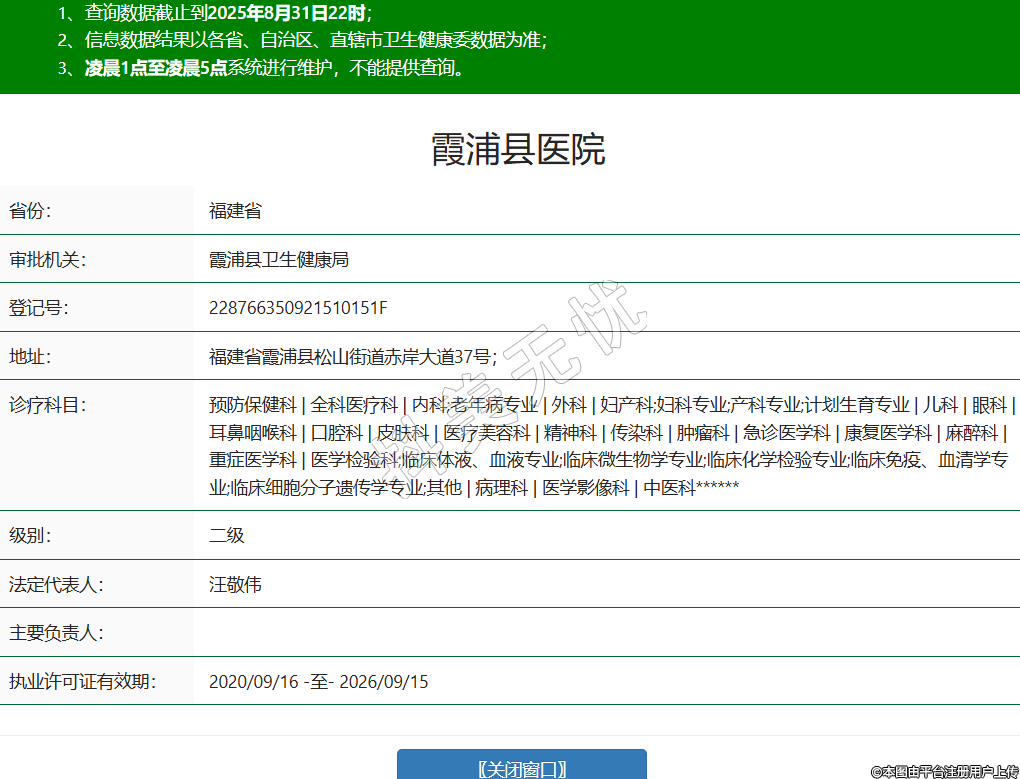 省份:福建省審批機(jī)關(guān):霞浦縣衛(wèi)生健康局登記號:228766350921510151F地址:福建省霞浦縣松山街道赤岸大道37號;診療科目:預(yù)防保健科 | 全科醫(yī)療科 | 內(nèi)科;老年病專業(yè) | 外科 | 婦產(chǎn)科;婦科專業(yè);產(chǎn)科專業(yè);計(jì)劃生育專業(yè) | 兒科 | 眼科 | 耳鼻咽喉科 | 口腔科 | 皮膚科 | 醫(yī)療美容科 | 精神科 | 傳染科 | 腫瘤科 | 急診醫(yī)學(xué)科 | 康復(fù)醫(yī)學(xué)科 | 麻醉科 | 重癥醫(yī)學(xué)科 | 醫(yī)學(xué)檢驗(yàn)科;臨床體液、血液專業(yè);臨床微生物學(xué)專業(yè);臨床化學(xué)檢驗(yàn)專業(yè);臨床免疫、血清學(xué)專業(yè);臨床細(xì)胞分子遺傳學(xué)專業(yè);其他 | 病理科 | 醫(yī)學(xué)影像科 | 中醫(yī)科******級別:二級法定代表人:汪敬偉主要負(fù)責(zé)人:執(zhí)業(yè)許可證有效期:2020/09/16 -至- 2026/09/15 -
