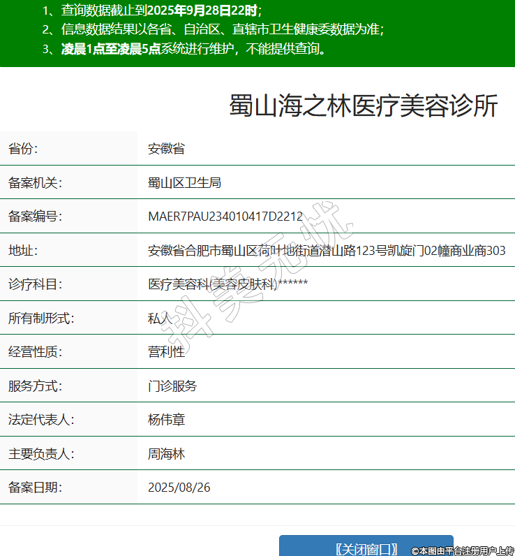 省份:安徽省備案機(jī)關(guān):蜀山區(qū)衛(wèi)生局備案編號(hào):MAER7PAU234010417D2212地址:安徽省合肥市蜀山區(qū)荷葉地街道潛山路123號(hào)凱旋門(mén)02幢商業(yè)商303診療科目:醫(yī)療美容科(美容皮膚科)******所有制形式:私人經(jīng)營(yíng)性質(zhì):營(yíng)利性服務(wù)方式:門(mén)診服務(wù)法定代表人:楊偉章主要負(fù)責(zé)人:周海林 -