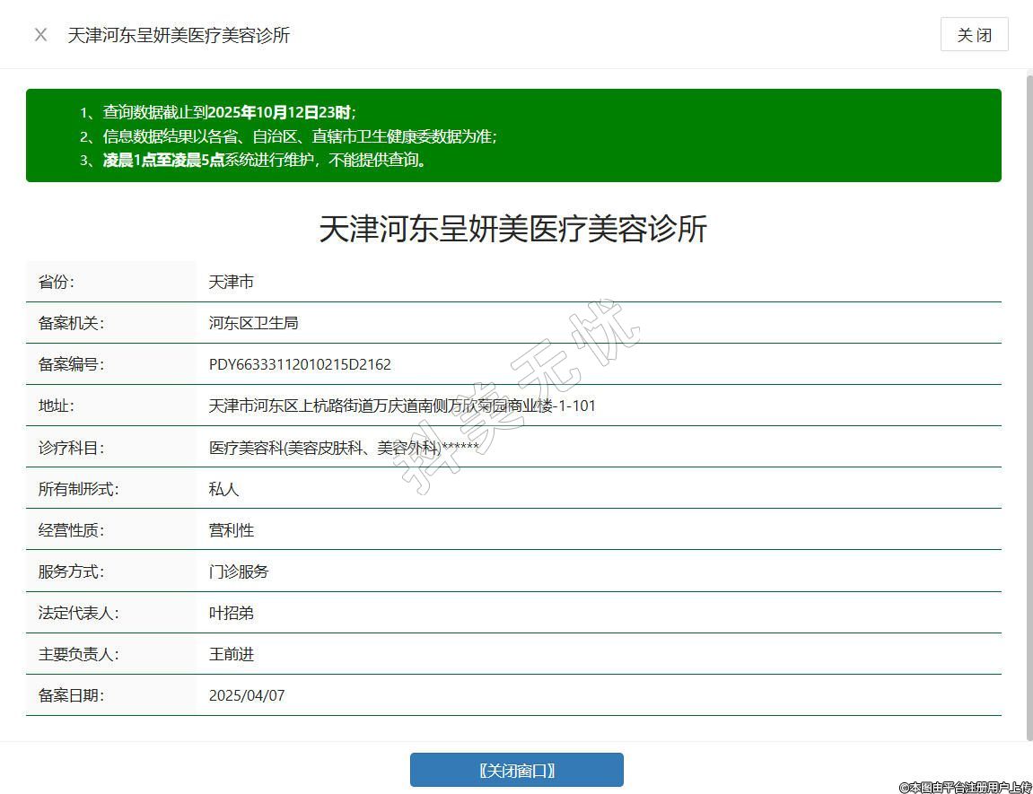 天津呈妍美醫(yī)療美容診所成立于2023年,位于天津市河?xùn)|區(qū)上杭路街道萬慶道南側(cè)萬欣菊園商業(yè)樓-1-101,是經(jīng)批準(zhǔn)設(shè)立的正規(guī)醫(yī)療美容機構(gòu),,持有醫(yī)療美容服務(wù)等相關(guān)行政許可,合規(guī)開展醫(yī)療美容業(yè)務(wù),配備無菌手術(shù)室及專業(yè)設(shè)備,有著專業(yè)的醫(yī)生團隊,秉持規(guī)范執(zhí)業(yè)理念,以合規(guī)資質(zhì)為基石,以專業(yè)團隊為支撐,專注為顧客提供嚴(yán)謹、可靠的醫(yī)療美容服務(wù)。