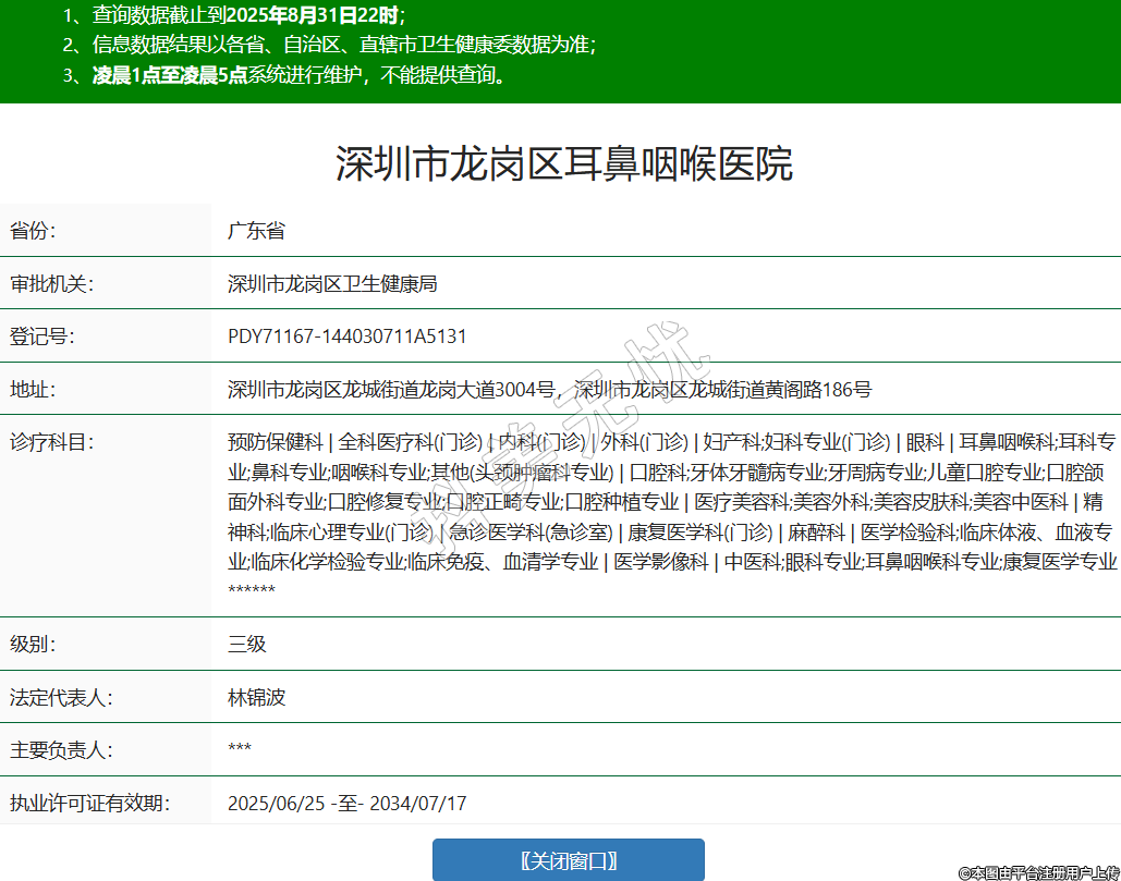 省份:廣東省審批機(jī)關(guān):深圳市龍崗區(qū)衛(wèi)生健康局登記號(hào):PDY71167-144030711A5131地址:深圳市龍崗區(qū)龍城街道龍崗大道3004號(hào),深圳市龍崗區(qū)龍城街道黃閣路186號(hào)診療科目:預(yù)防保健科 | 全科醫(yī)療科(門(mén)診) | 內(nèi)科(門(mén)診) | 外科(門(mén)診) | 婦產(chǎn)科;婦科專(zhuān)業(yè)(門(mén)診) | 眼科 | 耳鼻咽喉科;耳科專(zhuān)業(yè);鼻科專(zhuān)業(yè);咽喉科專(zhuān)業(yè);其他(頭頸腫瘤科專(zhuān)業(yè)) | 口腔科;牙體牙髓病專(zhuān)業(yè);牙周病專(zhuān)業(yè);兒童口腔專(zhuān)業(yè);口腔頜面外科專(zhuān)業(yè);口腔修復(fù)專(zhuān)業(yè);口腔正畸專(zhuān)業(yè);口腔種植專(zhuān)業(yè) | 醫(yī)療美容科;美容外科;美容皮膚科;美容中醫(yī)科 | 精神科;臨床心理專(zhuān)業(yè)(門(mén)診) | 急診醫(yī)學(xué)科(急診室) | 康復(fù)醫(yī)學(xué)科(門(mén)診) | 麻醉科 | 醫(yī)學(xué)檢驗(yàn)科;臨床體液、血液專(zhuān)業(yè);臨床化學(xué)檢驗(yàn)專(zhuān)業(yè);臨床免疫、血清學(xué)專(zhuān)業(yè) | 醫(yī)學(xué)影像科 | 中醫(yī)科;眼科專(zhuān)業(yè);耳鼻咽喉科專(zhuān)業(yè);康復(fù)醫(yī)學(xué)專(zhuān)業(yè)******級(jí)別:三級(jí)法定代表人:林錦波主要負(fù)責(zé)人:***執(zhí)業(yè)許可證有效期:2025/06/25 -至- 2034/07/17 -
