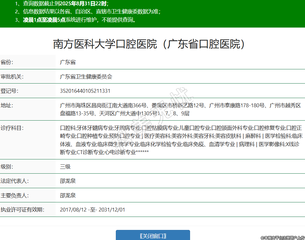 省份:廣東省審批機關(guān):廣東省衛(wèi)生健康委員會登記號:352016440105211331地址:廣州市海珠區(qū)昌崗街江南大道南366號、番禺區(qū)市橋新藝路12號、廣州市泰康路178-180號、廣州市越秀區(qū)盤福路13-35號、天河區(qū)廣州大道中1305號1、7、8、9層診療科目:口腔科;牙體牙髓病專業(yè);牙周病專業(yè);口腔粘膜病專業(yè);兒童口腔專業(yè);口腔頜面外科專業(yè);口腔修復(fù)專業(yè);口腔正畸專業(yè);口腔種植專業(yè);預(yù)防口腔專業(yè) | 醫(yī)療美容科;美容外科;美容牙科;美容皮膚科 | 麻醉科 | 醫(yī)學(xué)檢驗科;臨床體液、血液專業(yè);臨床微生物學(xué)專業(yè);臨床化學(xué)檢驗專業(yè);臨床免疫、血清學(xué)專業(yè) | 病理科 | 醫(yī)學(xué)影像科;X線診斷專業(yè);CT診斷專業(yè);心電診斷專業(yè)******級別:三級法定代表人:邵龍泉主要負(fù)責(zé)人:邵龍泉執(zhí)業(yè)許可證有效期:2017/08/12 -至- 2031/12/01 -