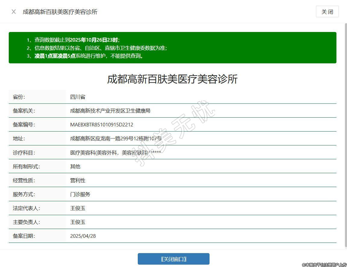 成都高新百膚美醫(yī)療美容診所成立于2025年,位于成都市高新區(qū)應龍南一路299號12棟附107號,是經(jīng)成都高新區(qū)市場監(jiān)督管理局登記、具備合法醫(yī)療美容服務資質的專業(yè)機構,聚焦輕醫(yī)美領域,提供光子嫩膚、膠原激活等項目,建立 “皮膚檢測 - 定制療程 - 健康追蹤” 的服務閉環(huán),合規(guī)開展醫(yī)療美容服務、健康咨詢等項目,致力于以規(guī)范診療與優(yōu)質服務陪伴求美者。