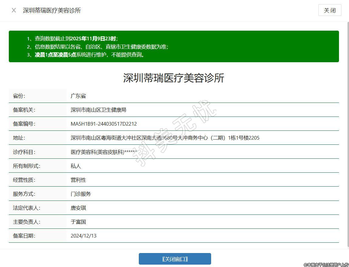 深圳蒂瑞醫(yī)療美容診所成立于2021年,位于深圳市南山區(qū)粵海街道大沖社區(qū)深南大道9680號大沖商務(wù)中心(二期)1棟1號樓2205,是經(jīng)相關(guān)部門批準(zhǔn)設(shè)立的正規(guī)醫(yī)療美容機構(gòu),嚴(yán)格遵循《醫(yī)療美容服務(wù)管理辦法》等相關(guān)規(guī)定,組建了具備豐富臨床經(jīng)驗的專業(yè)醫(yī)護團隊,業(yè)務(wù)涵蓋醫(yī)療美容服務(wù)、醫(yī)療器械銷售等合規(guī)項目,包括眼部整形、鼻部整形、面部填充及熱瑪吉等項目,為愛美人士提供規(guī)范、安心的醫(yī)療美容體驗。