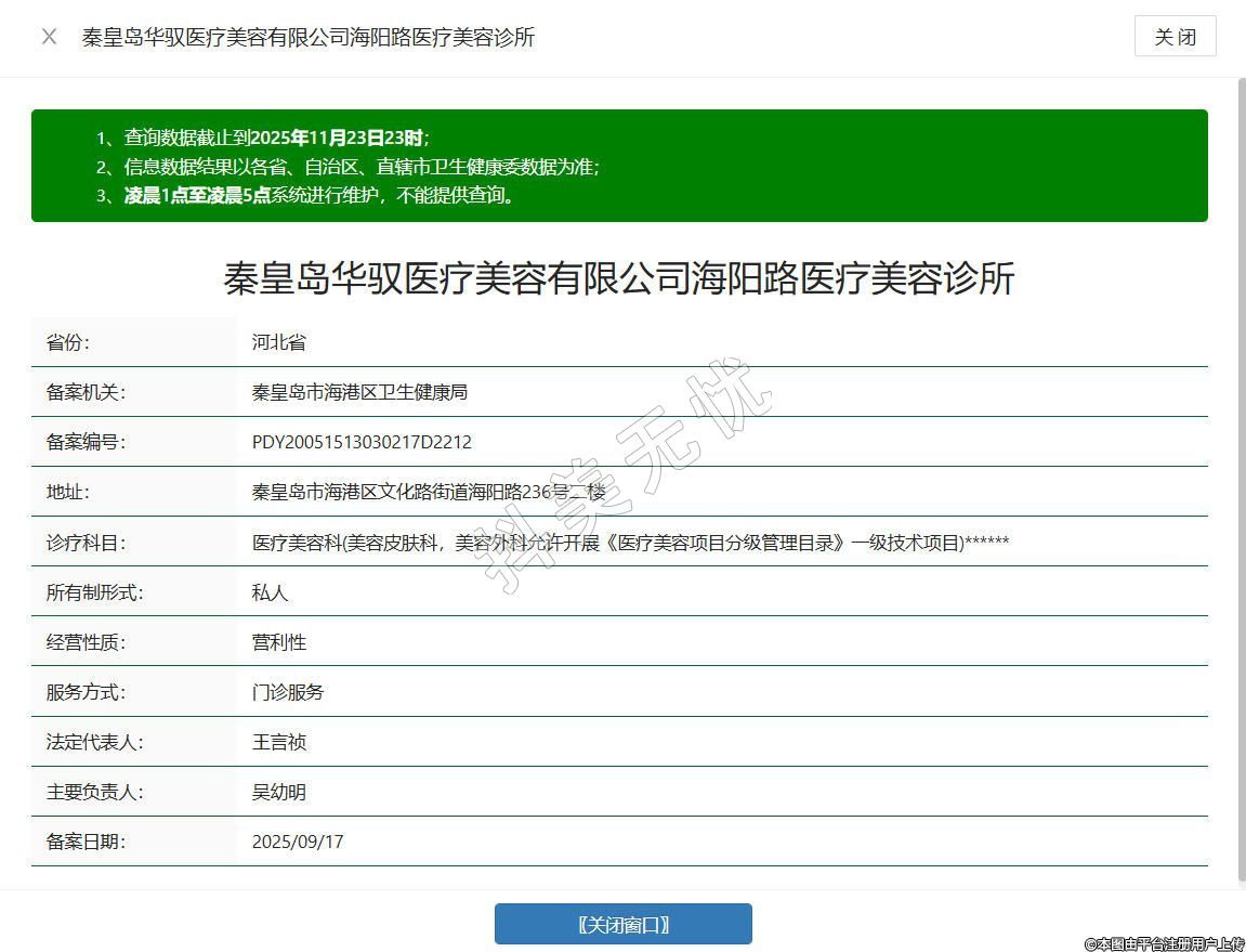 秦皇島華馭醫(yī)療美容診所成立于2025年,位于秦皇島市海港區(qū)文化路街道海陽路236號二樓,是持有《醫(yī)療機構(gòu)執(zhí)業(yè)許可證》的合規(guī)醫(yī)美機構(gòu),嚴(yán)匯聚經(jīng)驗豐富的醫(yī)美醫(yī)師團隊,以專業(yè)技術(shù)與美學(xué)理念為支撐,提供面部抗衰、皮膚護理、唇部整形等合規(guī)醫(yī)美服務(wù),秉持 “規(guī)范診療、個性定制” 的服務(wù)理念,從咨詢評估到方案制定,全程注重溝通與隱私保護,為求美者提供安心、專業(yè)的醫(yī)美體驗。