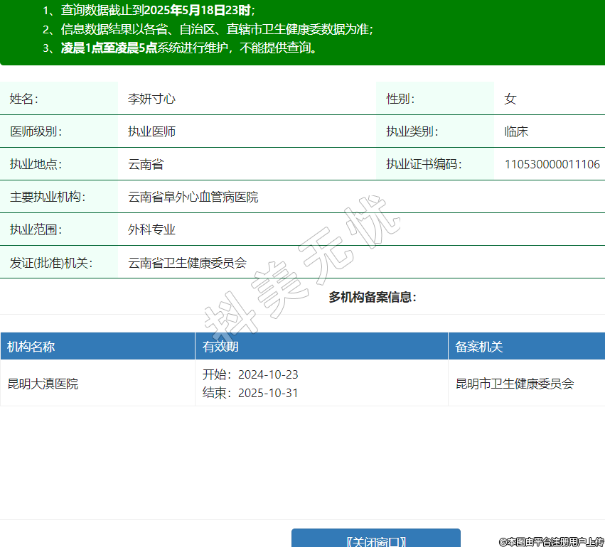 姓名:李妍寸心性別:女醫(yī)師級別:執(zhí)業(yè)醫(yī)師執(zhí)業(yè)類別:臨床執(zhí)業(yè)地點(diǎn):云南省執(zhí)業(yè)證書編碼:110530000011106主要執(zhí)業(yè)機(jī)構(gòu):云南省阜外心血管病醫(yī)院執(zhí)業(yè)范圍:外科專業(yè)發(fā)證(批準(zhǔn))機(jī)關(guān):云南省衛(wèi)生健康委員會(huì)多機(jī)構(gòu)備案信息:機(jī)構(gòu)名稱 有效期 備案機(jī)關(guān) 昆明大滇醫(yī)院 開始:2024-10-23結(jié)束:2025-10-31昆明市衛(wèi)生健康委員會(huì) -