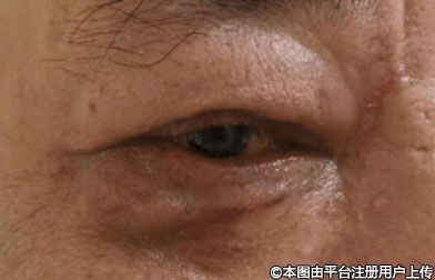 表現(xiàn):眼周無(wú)死角的動(dòng)態(tài)、靜態(tài)皺紋,嚴(yán)重的眶內(nèi)凹陷,上瞼皮膚松垂導(dǎo)致的三角眼,眼袋膨出,淚溝凹陷,下瞼皮膚松弛等