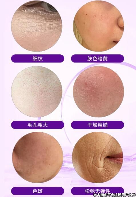 膚質(zhì)的改變:皮膚粗糙、毛孔粗大、膚質(zhì)灰暗無光澤、松弛、下垂、皺紋等;