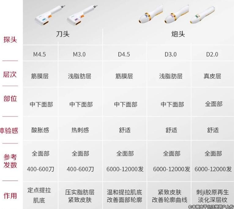刀頭M4.5+刀頭M3.0+炮頭D4.5+炮頭D3.0(俗稱:2刀2炮)適合:中重度面部松弛下垂、皺紋嚴重、肉肉臉、下頜脂肪堆積、眼周松弛、口角囊?guī)?、雙下巴、法令紋等
