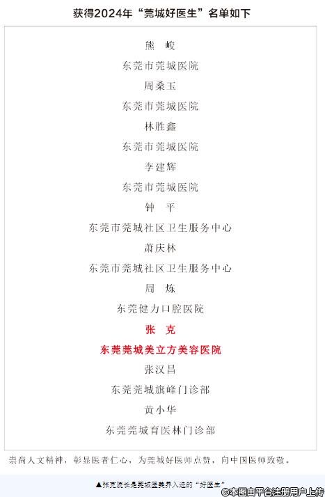 8月16日,莞城街道召開慶祝第七個“中國醫(yī)師節(jié)”暨2024年“莞城好醫(yī)生”表彰大會,對一批優(yōu)秀的醫(yī)護人員進行表彰,大會宣讀了《關(guān)于2024“莞城好醫(yī)生”的通報》,曾軼榮等領(lǐng)導(dǎo)嘉賓為10名獲得2024年度“莞城好醫(yī)生”代表頒發(fā)表彰證書。東莞美立方美容醫(yī)院張克榮獲“莞城好醫(yī)生”稱號。