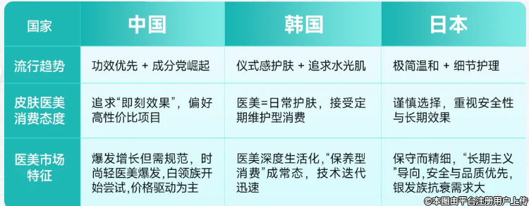 中國(guó)、韓國(guó)、日本同屬東亞文化圈,肌膚特性有一定共性(如易暗沉、黃褐斑高發(fā)),但因氣候環(huán)境、飲食習(xí)慣等差異,在護(hù)膚文化和醫(yī)美市場(chǎng)也存在顯著區(qū)別:
