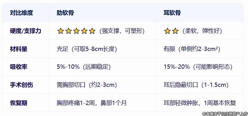 耳軟骨:單側(cè)取材易卷曲,需搭配“疊瓦狀縫合”技術;雙側(cè)取材可能導致耳廓支撐力下降。