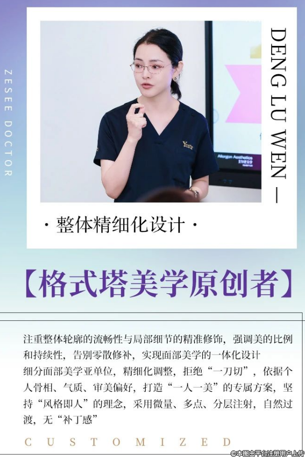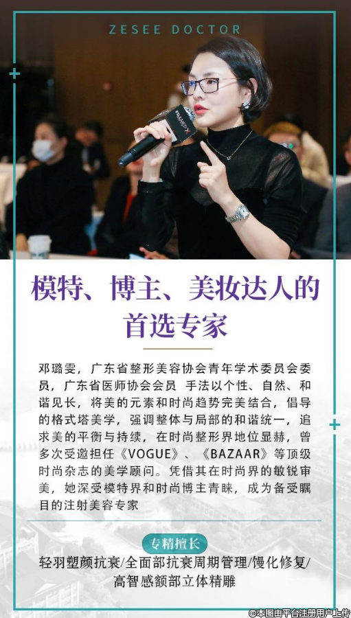 鄧璐雯,廣東省整形美容協(xié)會青年學術(shù)委員會委員,廣東省醫(yī)師協(xié)會會員手法以個性、自然、和諧見長,將美的元素和時尚趨勢完美結(jié)合,倡導(dǎo)的格式塔美學,強調(diào)整體與局部的和諧統(tǒng)一,追求美的平衡與持續(xù),在時尚整形界地位顯赫,曾多次受邀擔任《VOGUE》、《BAZAAR》等頂級時尚雜志的美學顧問。憑借其在時尚界的敏銳審美,她深受模特界和時尚博主青睞,成為備受矚目的注射美容專家。